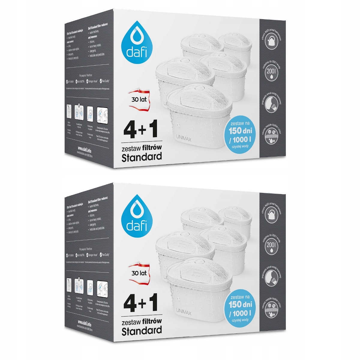 стандартний фільтр DAFI Unimax призначений для поліпшення якості води. Стандарт, що подається на воду DAFI, є альтернативою водній пляшці. Крім того, це запобігає накопиченню осаду на нагрівальних елементах чайника, праски та кавоварки. Продуктивність фільтру: 30 днів або бл. 150-200 л води (залежно від її якості)