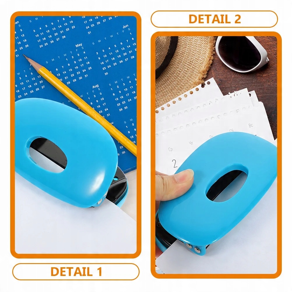 Конструкція перфоратора виготовлена з ABS, матеріалу з високою пробивною здатністю. Він дуже маленький і вишуканий, більш компактний і зручний для зберігання в ящику. Діркопробивач може точно регулюватися відповідно до положення пробивання, і його легко використовувати з легким натиском. Продукт є корисним інструментом, який використовується вдома, у школі, в офісі, у подорожах тощо.