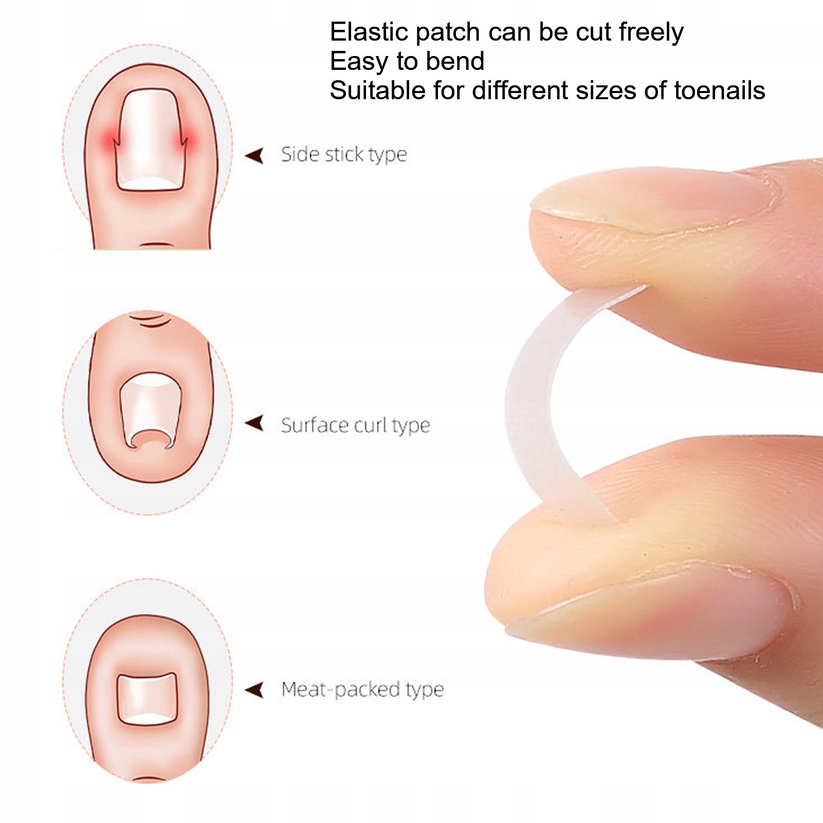 Особливості: 1. Підходить до різних розмірів: гнучкий пластир можна вирізати вільно і легко згинати, що підходить для різних розмірів нігтів на ногах.