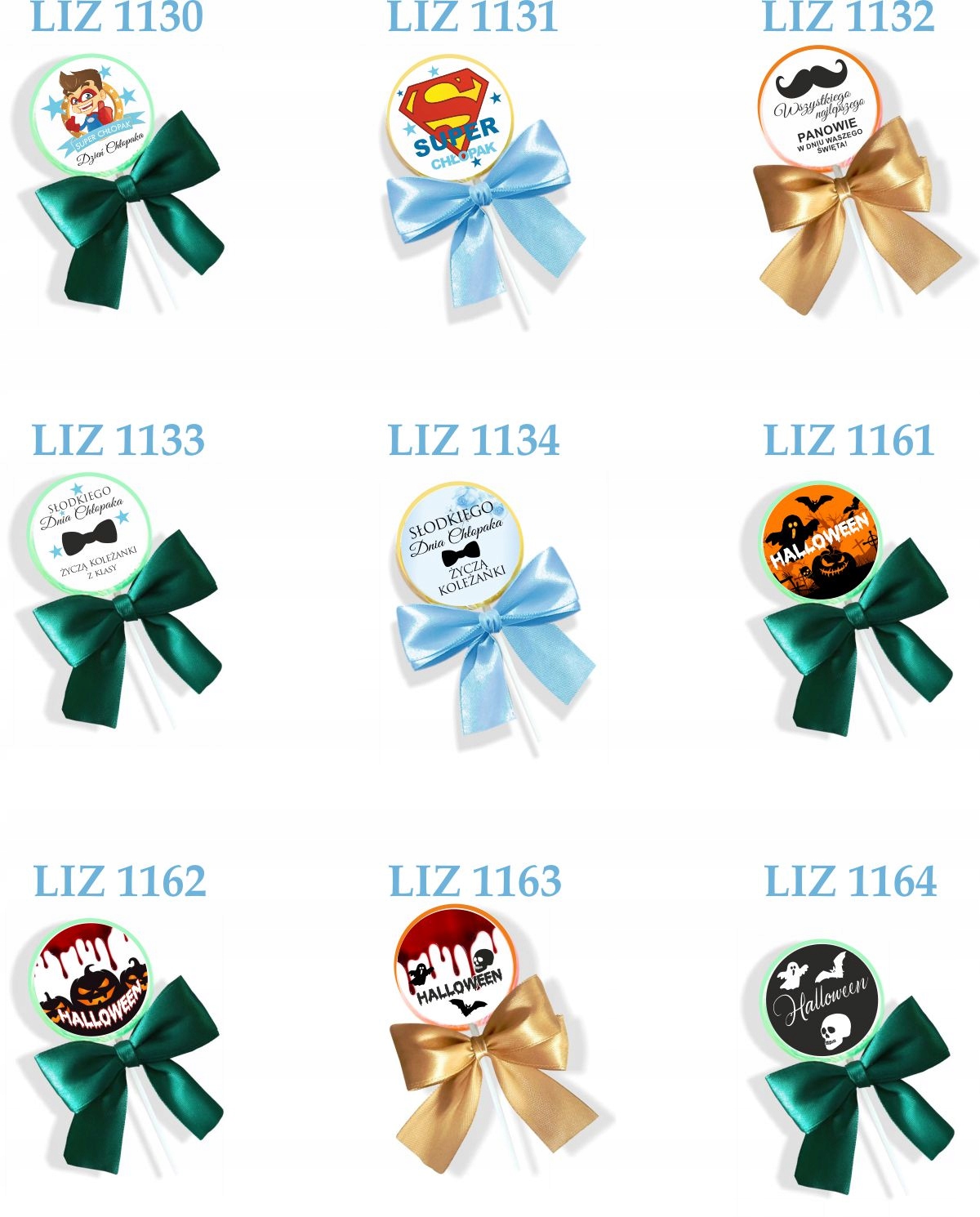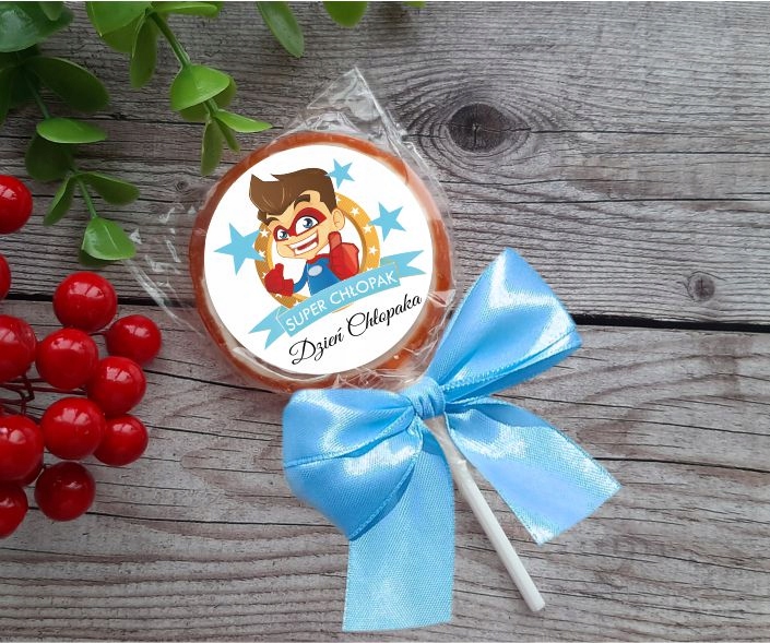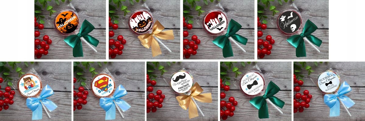 Льодяник + наклейка + бант, всі ці товари упаковані в окремі групи, для самостійної збірки (це знижує ризик пошкодження при транспортуванні). Отримавши вироби, слід наклеїти готову наклейку та самостійно прикріпити бантик. Бантики складені та готові до наклеювання на прозору гумку.