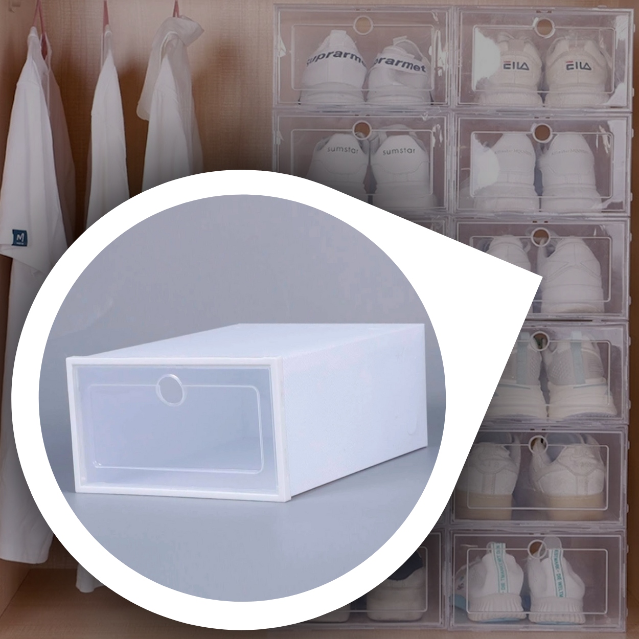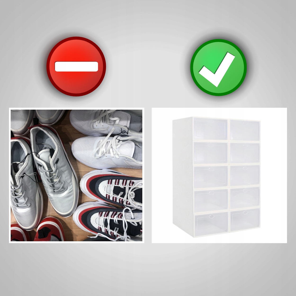 Прозорі коробки для взуття для захисту взуття від вологи та пилу. Вони також допоможуть вам підтримувати порядок у вашому домі чи гардеробі. Коробка виготовлена з напівпрозорого тонкого пластику. Завдяки напівпрозорості вам не потрібно відкривати коробку, адже ви можете побачити, що всередині.