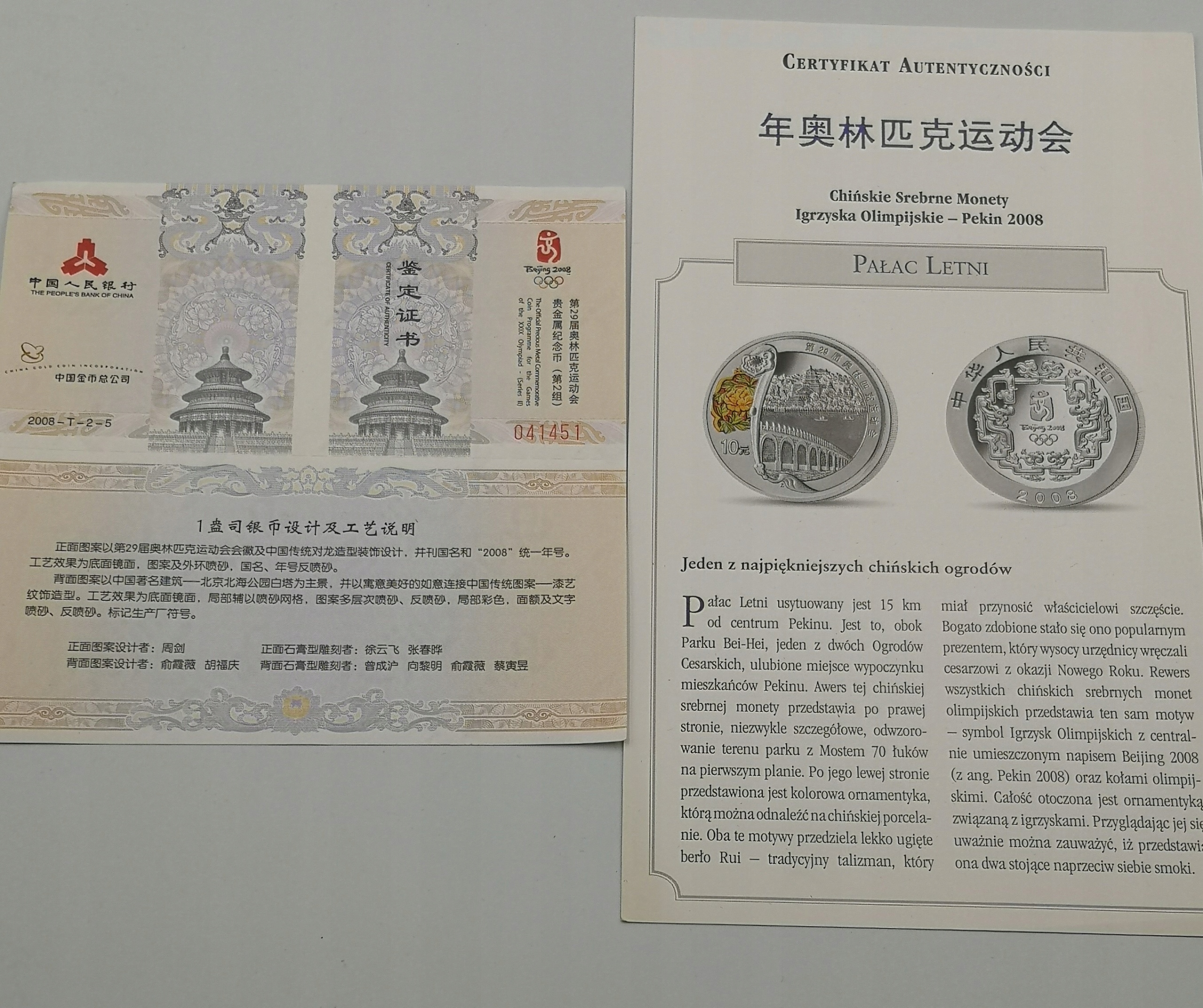 10 юанів Китайські ігри в Пекіні 2008 Літній палац Ag999 1 унція з сертифікатом польською та китайською мовами