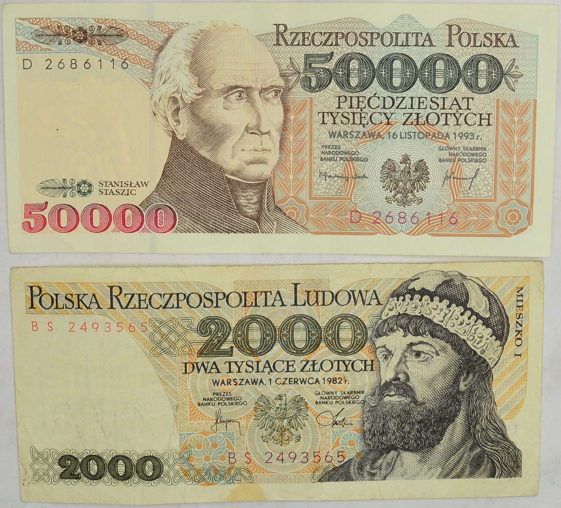 - Опис: У набір входять банкноти номіналом: PRL - 2000 PLN 1982 BS, ІІІ Польська Республіка - 50 000 PLN 1993
