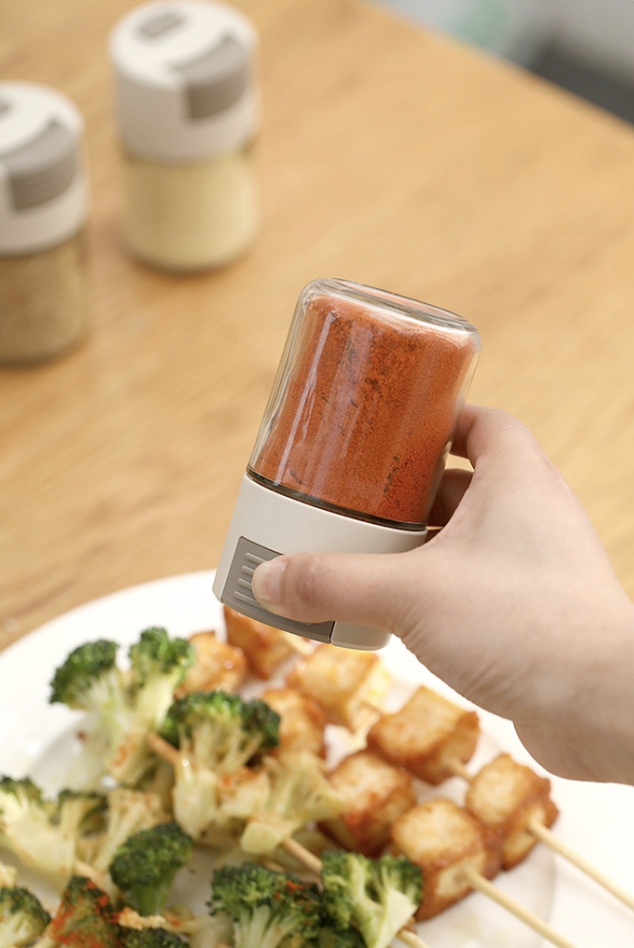 Скляний контейнер для спецій із кнопкою вимірювання 5 г, без необхідності відкручувати кришку.
