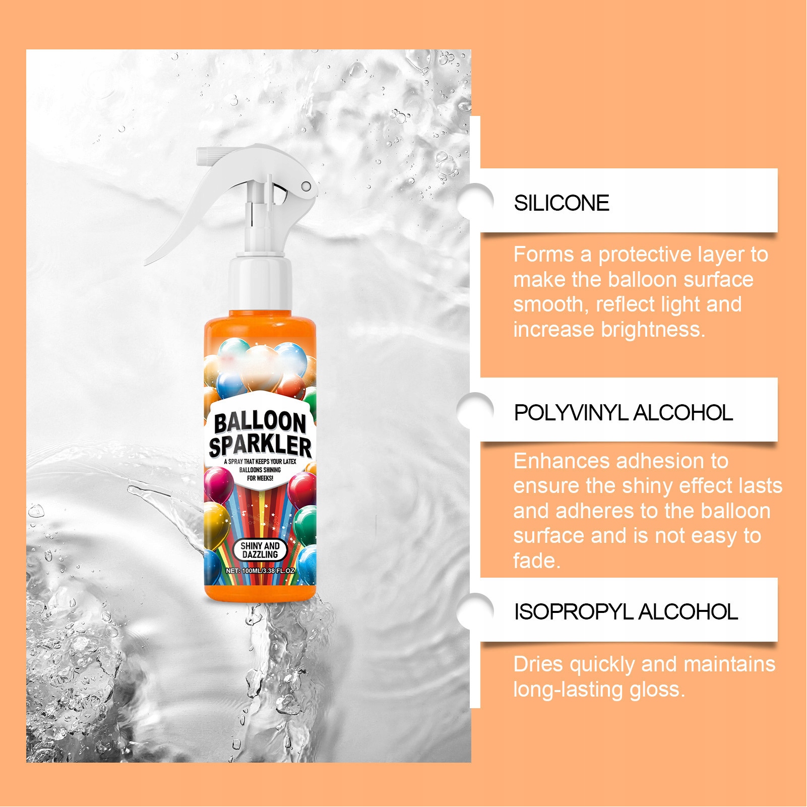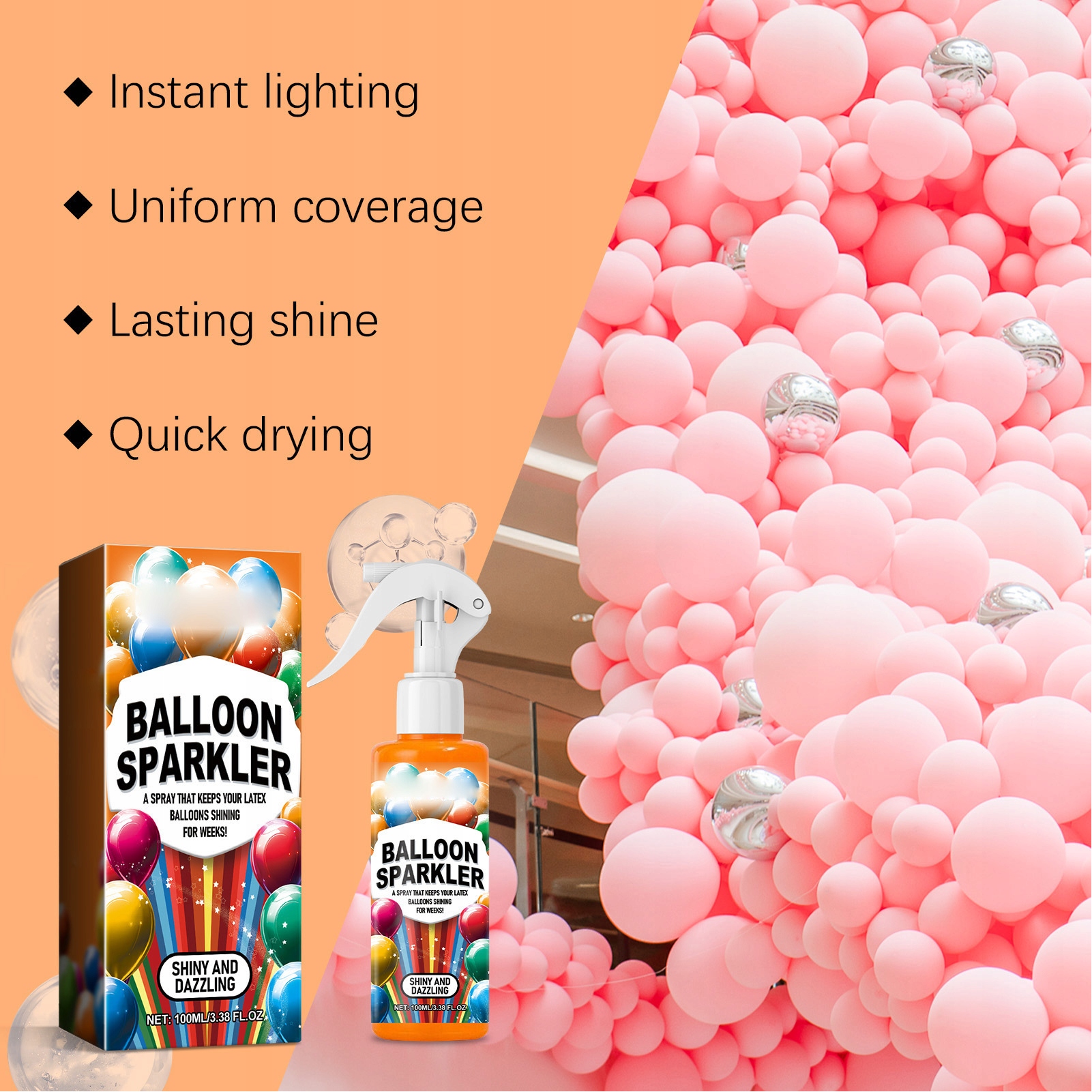 1. Збільште атмосферу: спрей для блиску на повітряній кулі може підняти атмосферу ваших подій, завдяки яким ваші зустрічі ще більш захоплюючі. Це зміцнює повітряні кулі, допомагаючи їм запобігти їм тендітним і спливаючим.