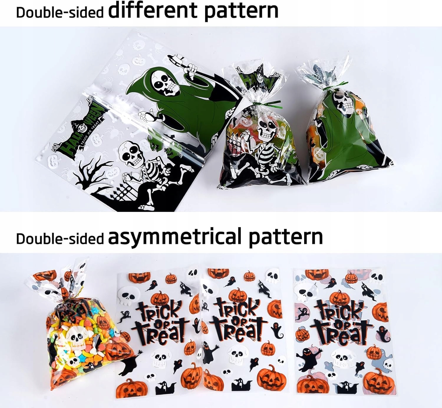 - Матеріал найвищої якості: целофанові пакети для ласощів на Хелловін виготовлені з високоякісного орієнтованого поліпропілену (OPP), міцного, міцного та нетоксичного, що дозволяє багаторазове використання.