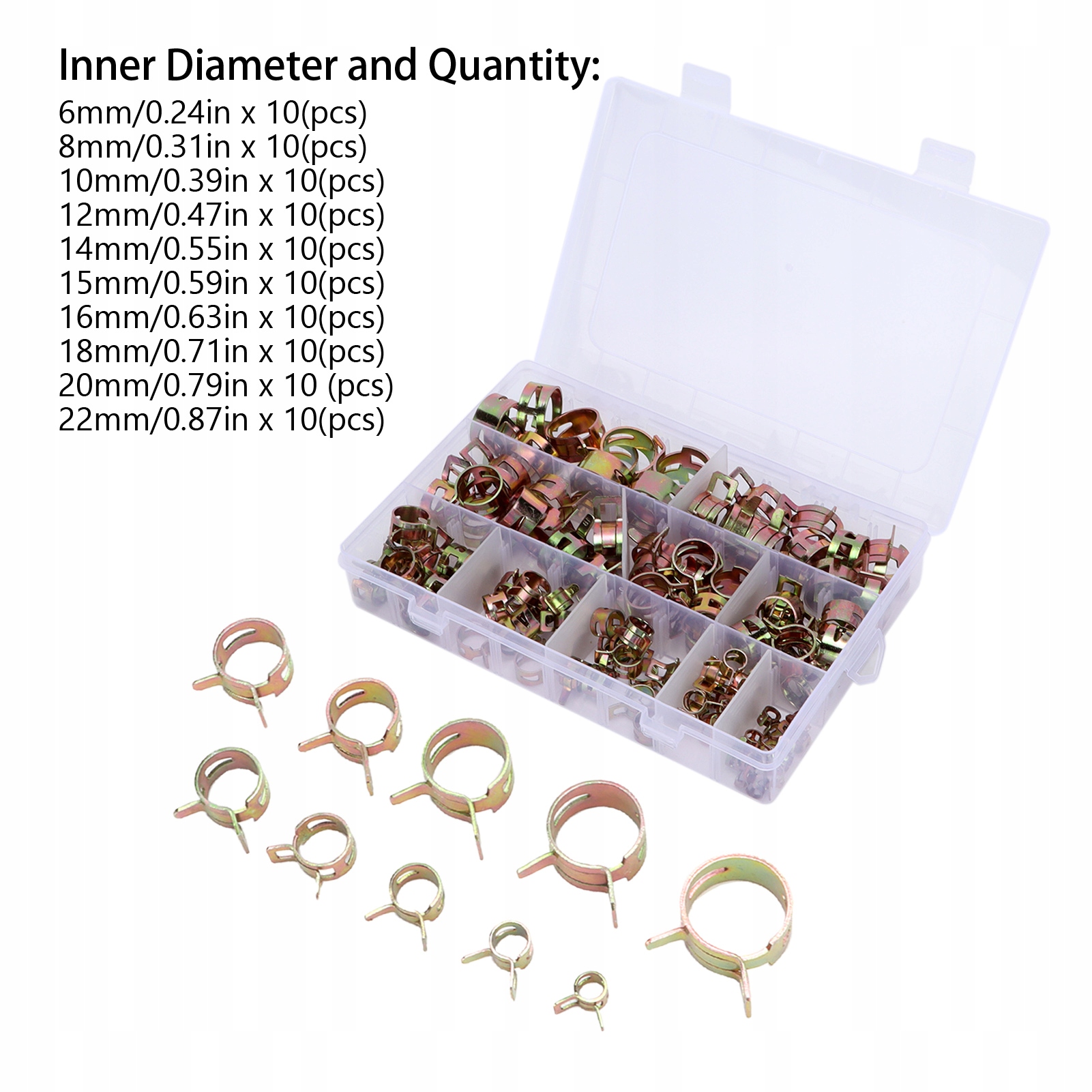 1. Включаючи 100 шт. пружинних затискачів із 10 різними розмірами внутрішнього діаметра, по 10 шт. для кожного розміру.