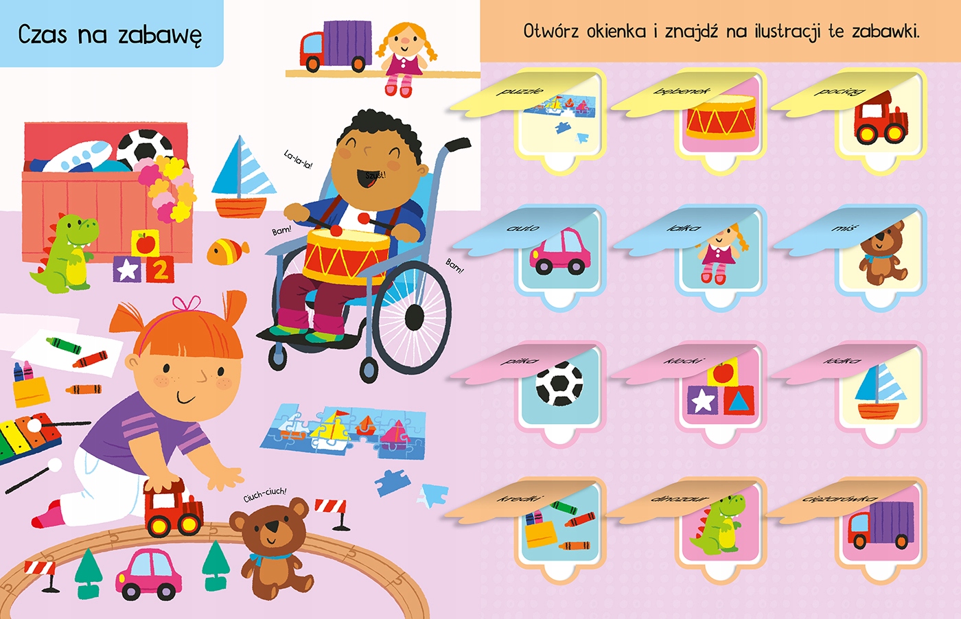 Багато вікон у цій книзі точно сподобаються маленьким дослідникам, які люблять шукати та вивчати нові слова! Вони стосуються близьких дітям питань: їжі, одягу, іграшок, тварин і кольорів.