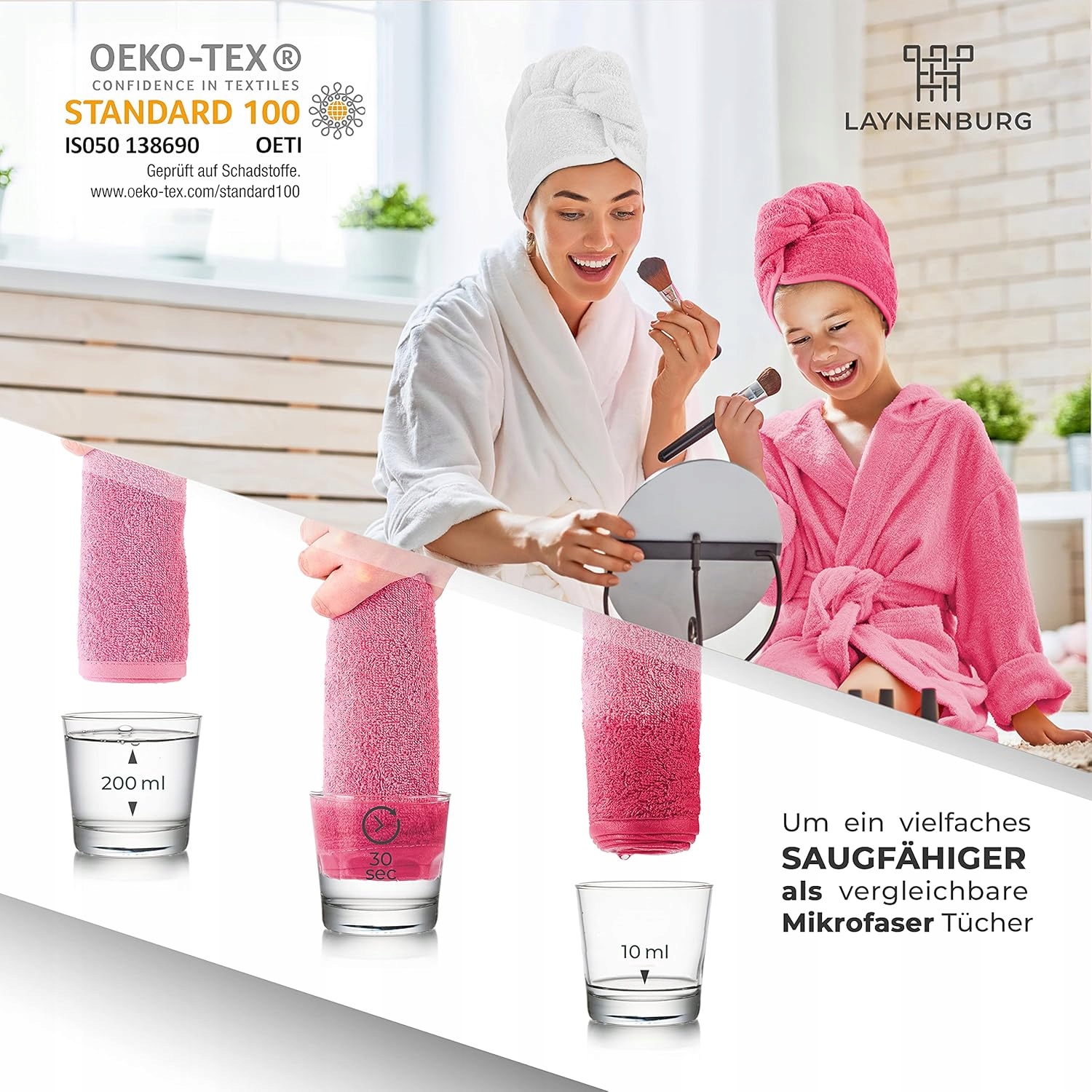 Дуже поглинаюча і швидка тканина для волосся виготовлена з чистого бавовни Террі, завдяки якому він поглинає вологу від волосся в багато разів швидше, ніж мікрофібра Turbana, кінчики та тріщини ідеально тримаються за всі типи волосся завдяки довжині 70 см . Our towel with cotton cotton button ensures optimal adhesion regardless of whether it is short long or curly hair. Для жінок і дітей, заощаджуючи цінний час завдяки нашому тюрбану, загортаючи волосся в мить ока, ви можете одночасно виконувати інші заходи та скоротити час висихання до мінімум і піклуватися природного бавовни з вагою 360 г². Ökotex Standard 100 сертифікатів і підходить для миття при 40 градусах підходить для сушіння в барабанній сушарці
