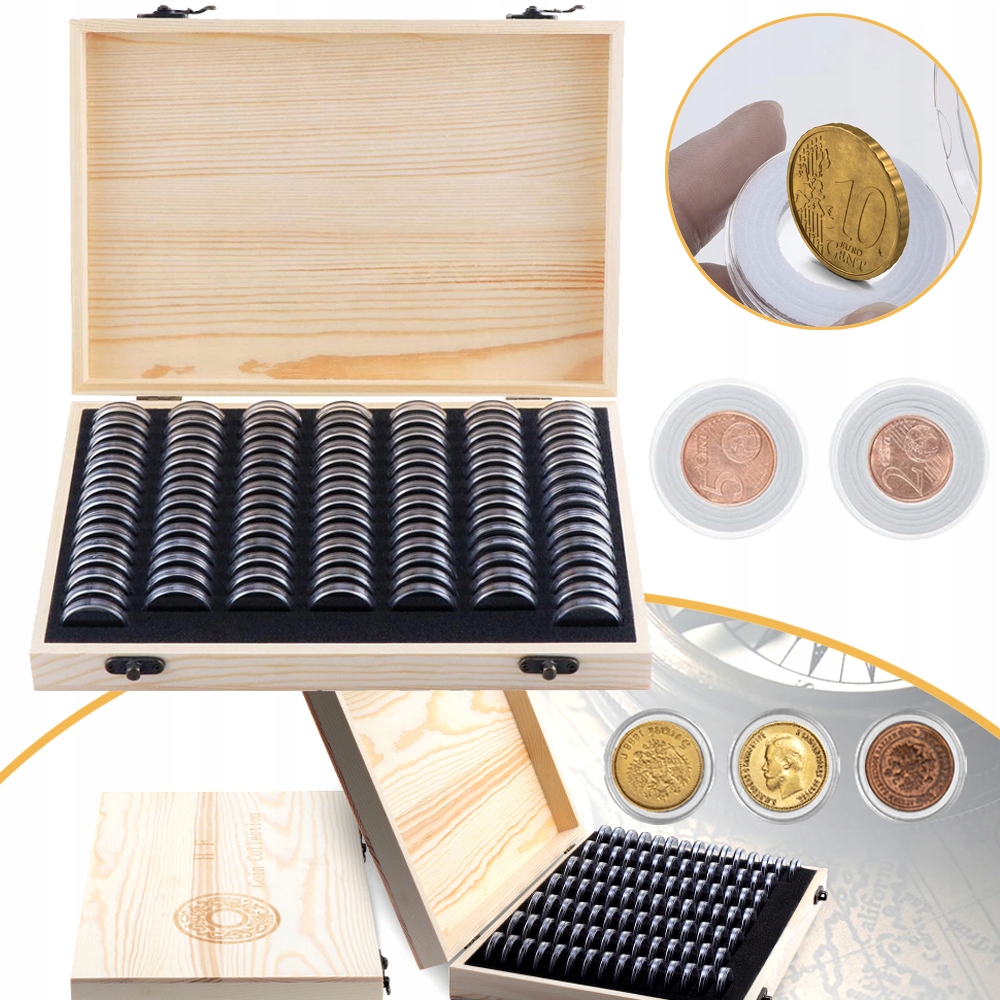🪙🪙 【Коробка для зберігання дерев’яної монет】 Розмір коробки для зберігання становить приблизно 280x190x45 мм, виготовлений з преміум -соснових деревини, щоб утримувати капсули пластикової монет 100pcs. Прозорі капсули для монет полегшують зберігати, переглядати та обмінювати монети.