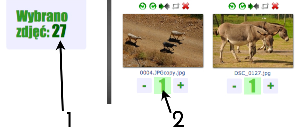 Кожну фотографію можна роздрукувати один або кілька разів. Виберіть кількість за допомогою знаків плюс і мінус під фотографіями. У верхньому лівому куті показано, скільки фотографій уже вибрано.