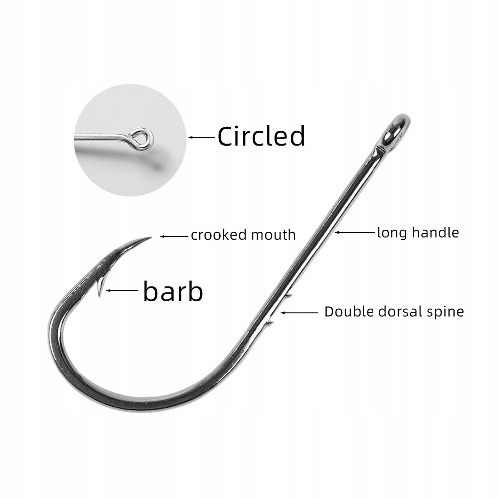 3. Рибальські гачки J мають носову точку, з’єднану для надійного закріплення, і зміщену точку, щоб гачок краще проникав у сором’язливу рибу.