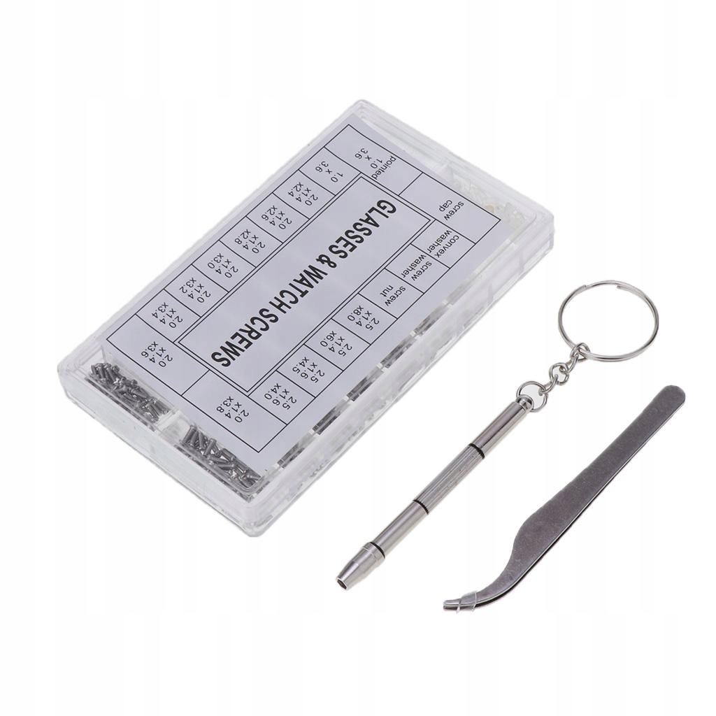 Інструмент для ремонту окулярів включає: гайки, ковпачки, шайби, наконечники, викрутку та пінцет.