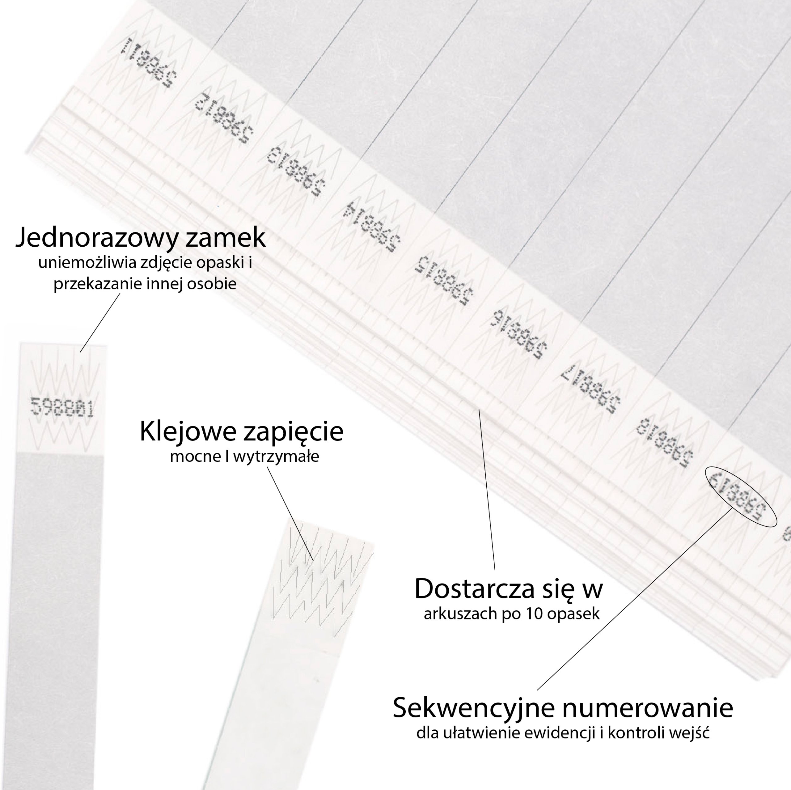 Кожна упаковка містить 1000 Tyvek Браслети ®. Кожен браслет пронумерований для підвищеної надійності. Внутрішня сторона браслета Tyvek® біла.