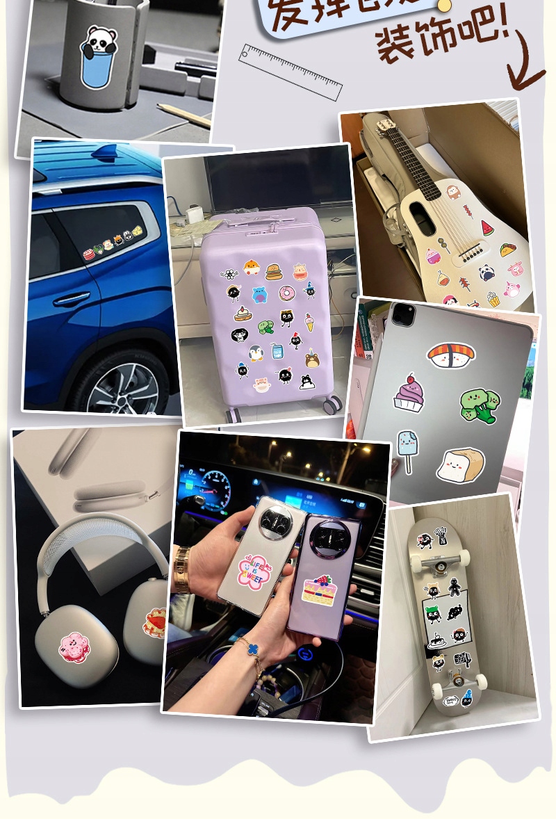 наклейки можна творчо використовувати для прикраси різних повсякденних предметів, таких як мобільний телефон, ноутбук, кухоль, ноутбук, комп'ютер, велосипедний шолом, ручка, велосипед або гардероб.