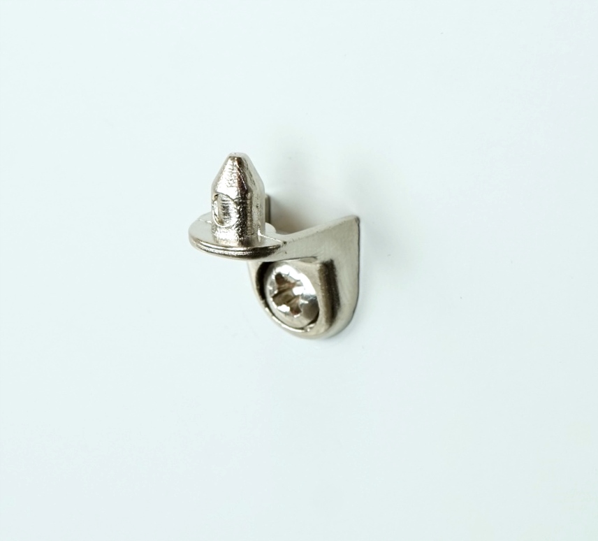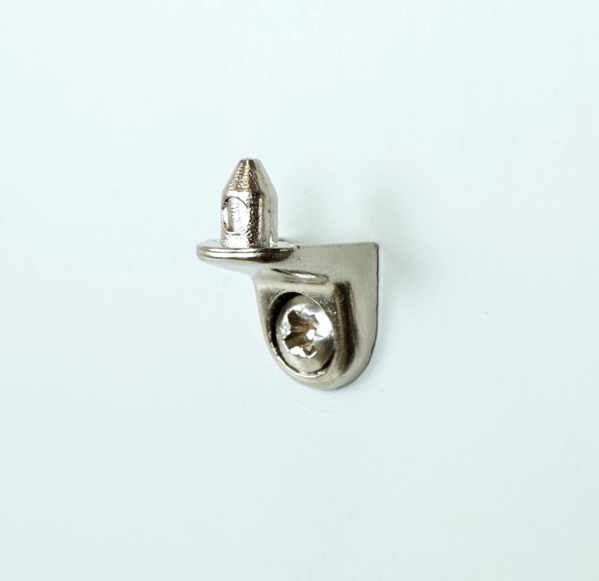 Полиці використовуються в дерев’яних або меблевих полицях. Опора зі штифтом і єврогвинтом має один штифт для кріплення в полиці. Його слід прикрутити до меблів за допомогою шурупа або єврошурупа. Призначений для підтримки полиць - особливо там, де існує ризик висування полиць.