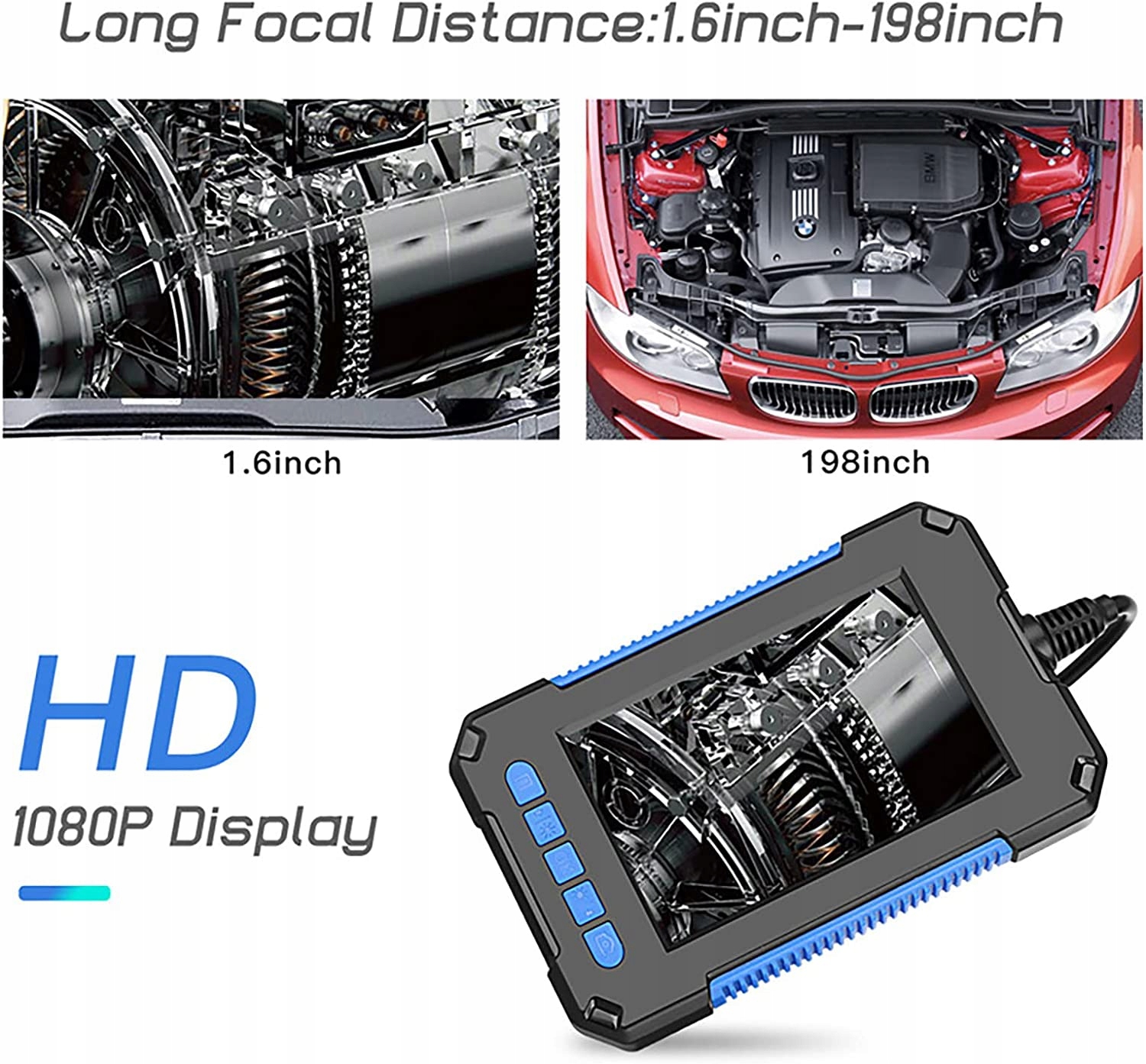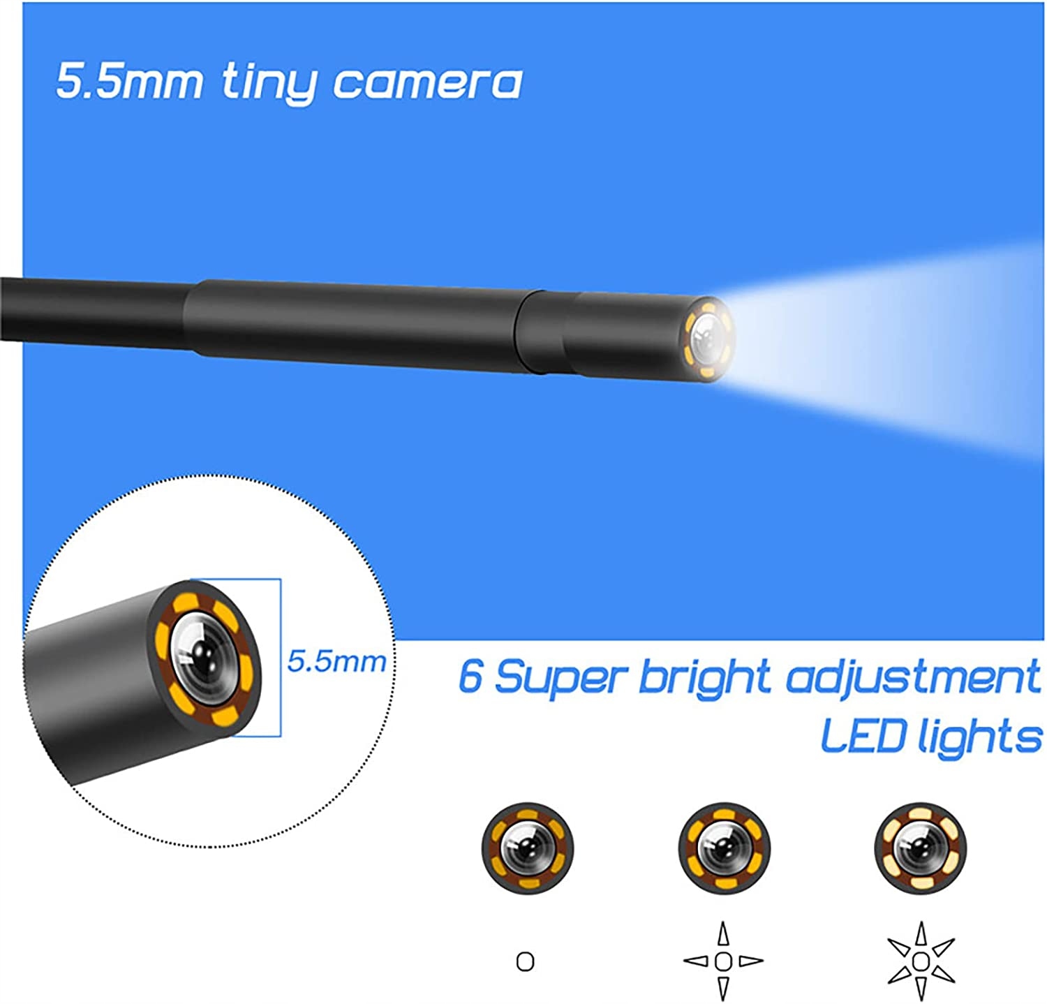Водонепроникна камера та напівжорсткий кабель Завдяки напівжорсткому кабелю він достатньо довгий і легко підтримує свою форму, щоб пересуватися у важкодоступних місцях. Водонепроникна камера IP67, наш ендоскоп може працювати у вологому середовищі та навіть занурюватися під воду. 43-дюймовий екран і регульоване світлодіодне підсвічування Використовуючи 43-дюймовий екран HD-камери з 8 регульованими світлодіодними підсвічуваннями, ви можете робити чіткі зображення та записувати відео. Телефон чи додаток не потрібні. HD-ендоскоп із високою передачею кольору та вдосконаленим сенсором забезпечує чітке зображення з багатим контрастом і дуже точними деталями. Завдяки високій роздільній здатності зображення 1920 x 1080 пікселів кожна поверхнева структура, перевірена нашою оглядовою камерою, є чіткою, має високий контраст і точно відтворює колір на моніторі. Він може виявити навіть незначні несправності. Акумулятор 2600 мАг Ендоскоп має вбудовану батарею, яка може працювати протягом 34 годин після повної зарядки. ідеально підходить для перевірки відсутніх елементів, трубопроводів, клапанів, пухирів, корозійних витоків, пошкоджених частин, пошкоджених частин або заблокованих частин. Промислова ендоскопічна камера з двома лінзами, ендоскоп, оснащений як передньою камерою 1080P, так і боковою камерою разом на зонді, ви можете перевіряти в іншому вигляді, що полегшує керування.