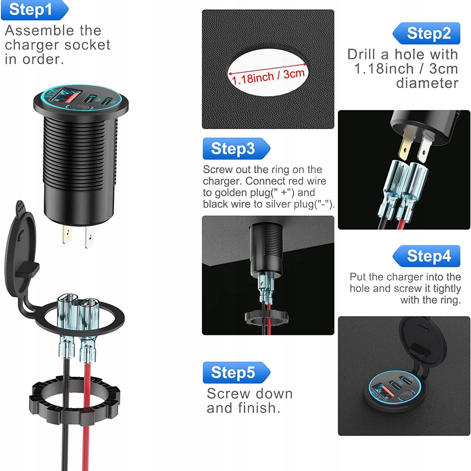 перемикач/перемикач. Цей декілька розетки USB 12/24 V оснащений перемикачем/перемикачем, який економить енергію і запобігає розряду акумулятора в стані бездіяльності. (Після встановлення не забудьте ввімкнути перемикач живлення, щоб перевірити, чи підключено блок живлення.)