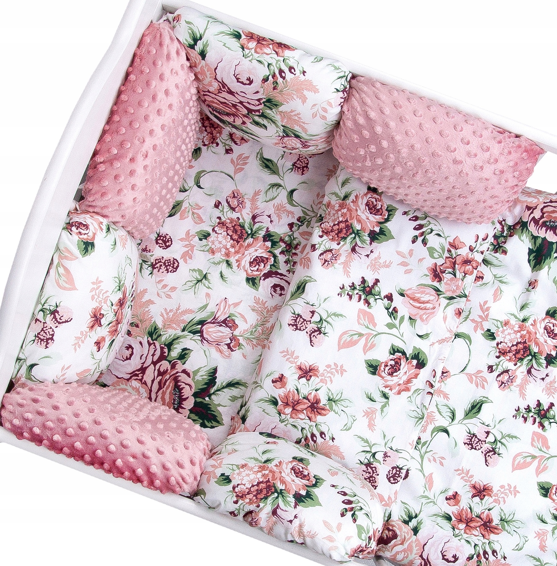 - 6 подушок приблизно 30x30 см із зав’язками, що утворюють захист для ліжка (3 подушки з норки та 3 бавовняні подушки)