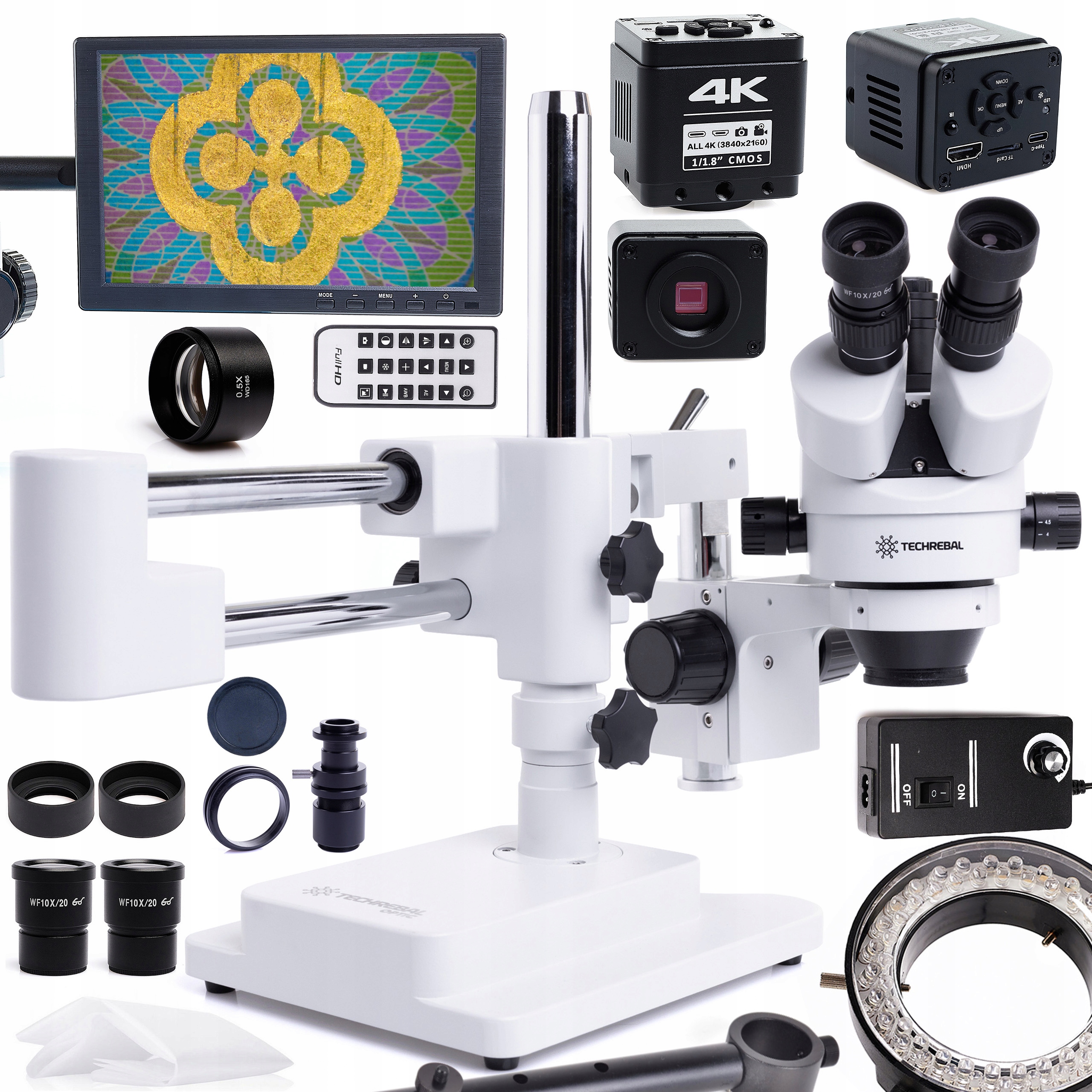 Тринокулярний мікроскоп Techrebal 10HW 7-45X + світлодіодне освітлення 56x + 0,5 Barlow + 10-дюймовий дисплей + камера Techrebal Black PRO 4K 8mp + тримач дисплея