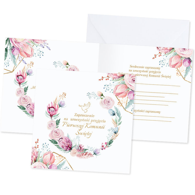 - Універсальні запрошення для Святого Причастя. прикрашені квітковим мотивом. У набір входить 10 універсальних запрошень з готовим текстом для заповнення всередині та 10 конвертів
