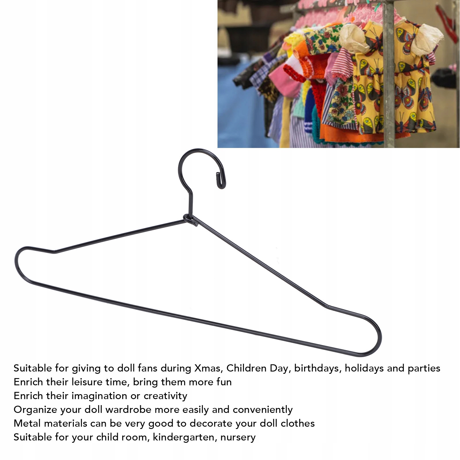 4. Основне призначення: Ви можете використовувати ці вішалки, щоб легше та зручніше організувати гардероб вашої ляльки. Металеві матеріали можуть бути дуже хорошими для декорування лялькового одягу, підходять для дитячої кімнати, дитячого садка, ясла