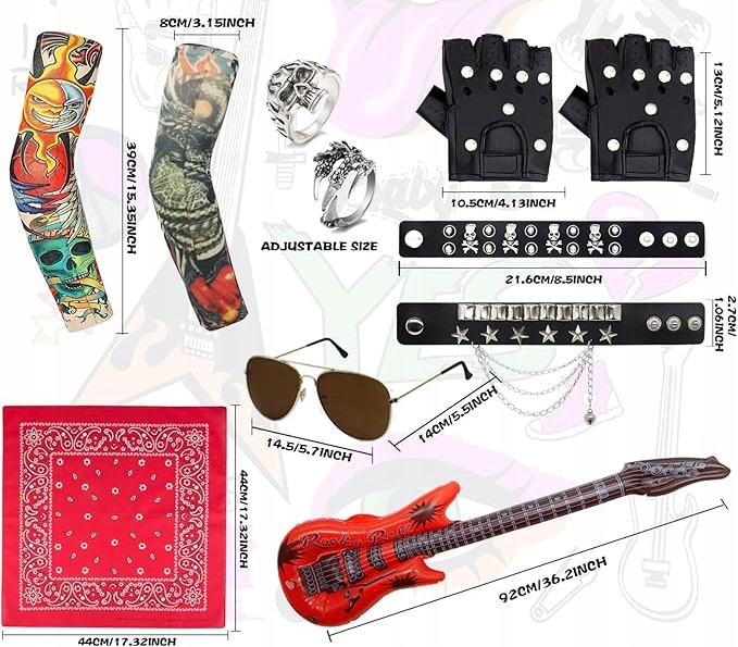 Повний комплект аксесуарів включає сонцезахисні окуляри, чорний поліуретан рукавички , ретро-хустку, браслети з черепами, тимчасові татуювання на руках, надувну гітару та стильні каблучки.
