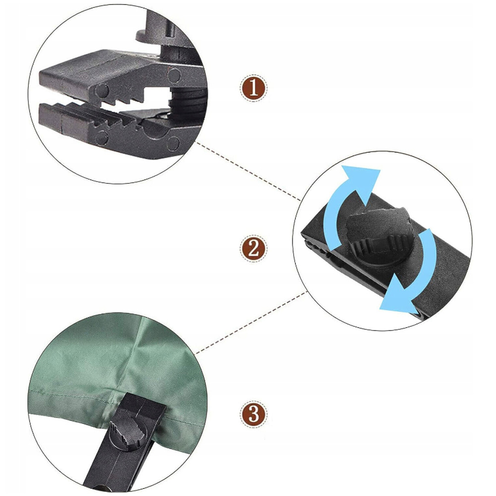 ✅ Легке складання та розбирання: має гвинт на затиску, який може контролювати щільність затиску без пошкодження брезент, міцні затискачі для брезенту, розроблені з регульованими спіральними гвинтами, паща алігатора з зубами утримують брезент набагато стабільніше. Затискач для кемпінгу можна легко використовувати, повертаючи диск, щоб забезпечити швидший і безпечніший контроль тиску, не пошкоджуючи полотно.