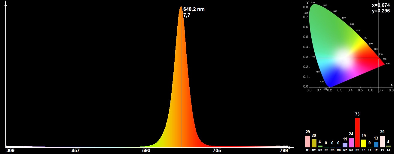 - домінуюча довжина хвилі - 640-650 нм (648 нм*)