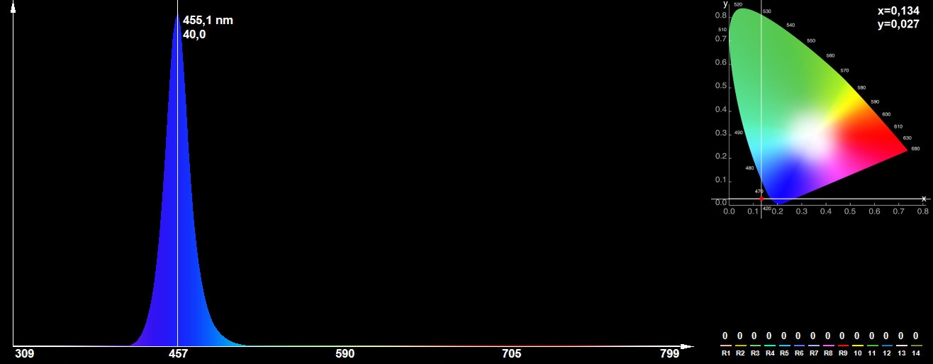 - домінуюча довжина хвилі - 450-460 нм ( 455 нм* )