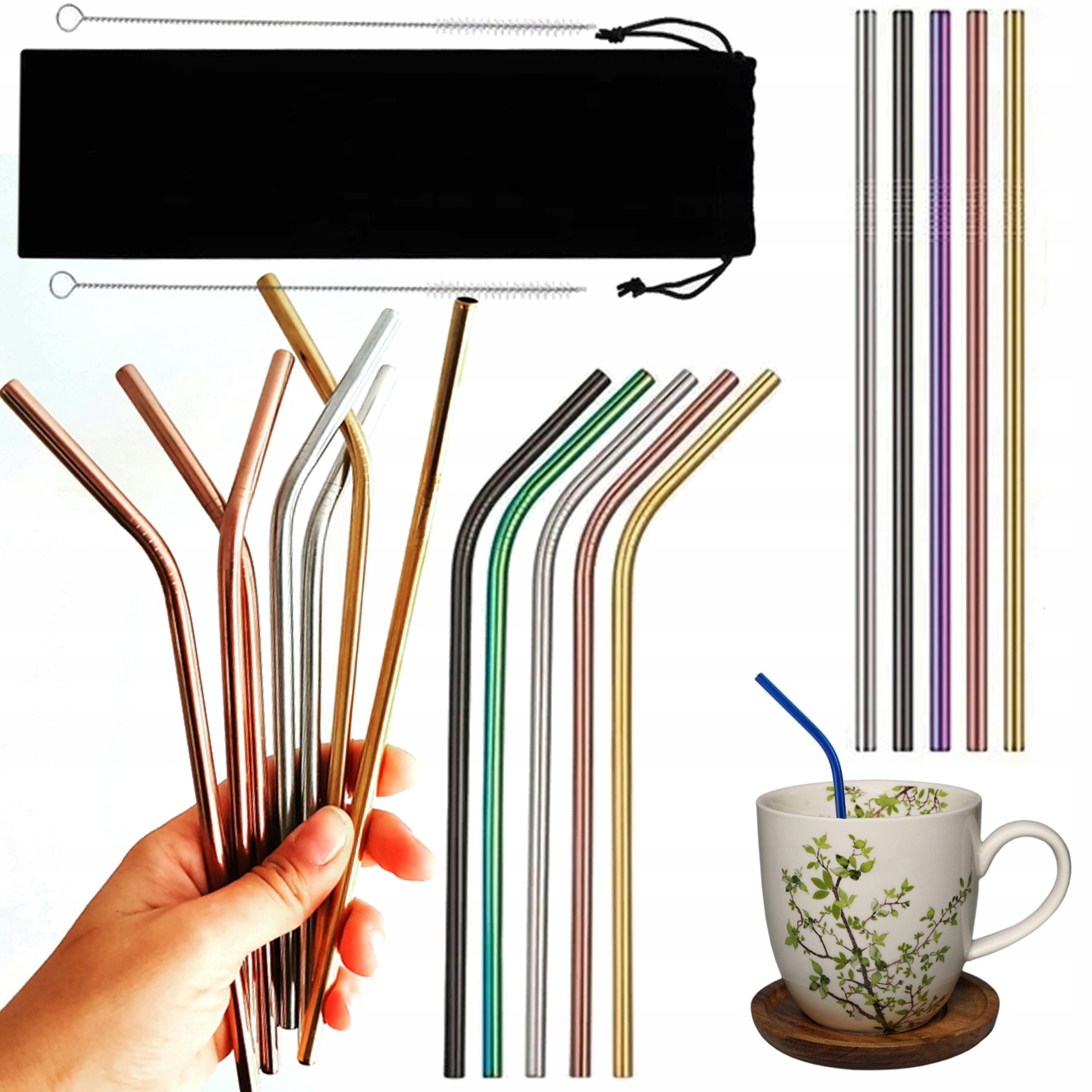 10x METALOWE SŁOMKI RURKI WIELORAZOWE DO NAPOJÓW + CZYŚCIK