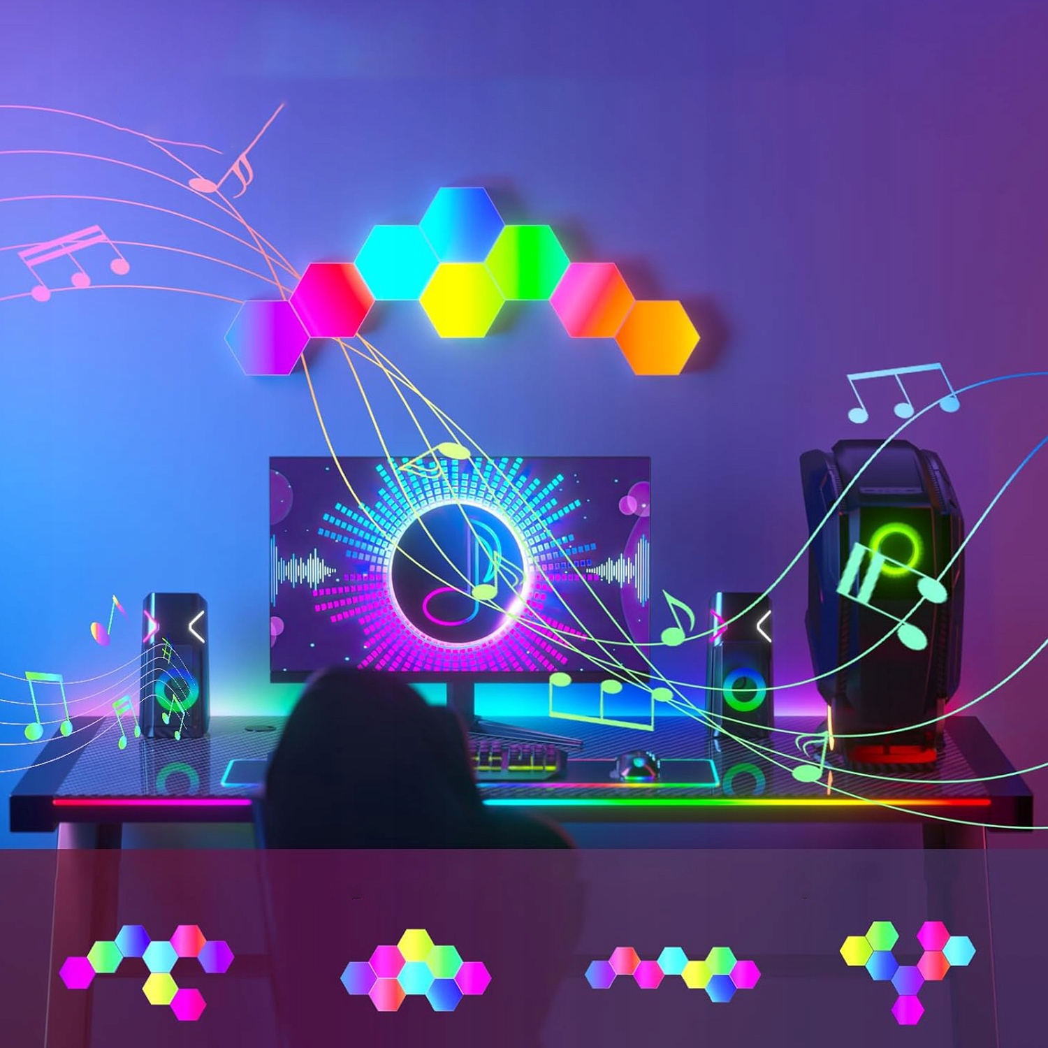 Світлодіодні світлові панелі легко синхронізуються зі звуками гри чи телевізора. Покращуйте враження від ігор, фільмів і музики за допомогою яскравого освітлення, 16 мільйонів кольорів і динамічних режимів. На відміну від інших статичних ігрових ліхтарів, наші шестикутні світлодіодні ліхтарі створюють більш захоплюючі відчуття під час гри та перегляду фільмів або матчів! Коли прийде час тримати обидві руки на клавіатурі та миші, скористайтеся голосовими помічниками Alexa або Google, щоб керувати світлом без рук