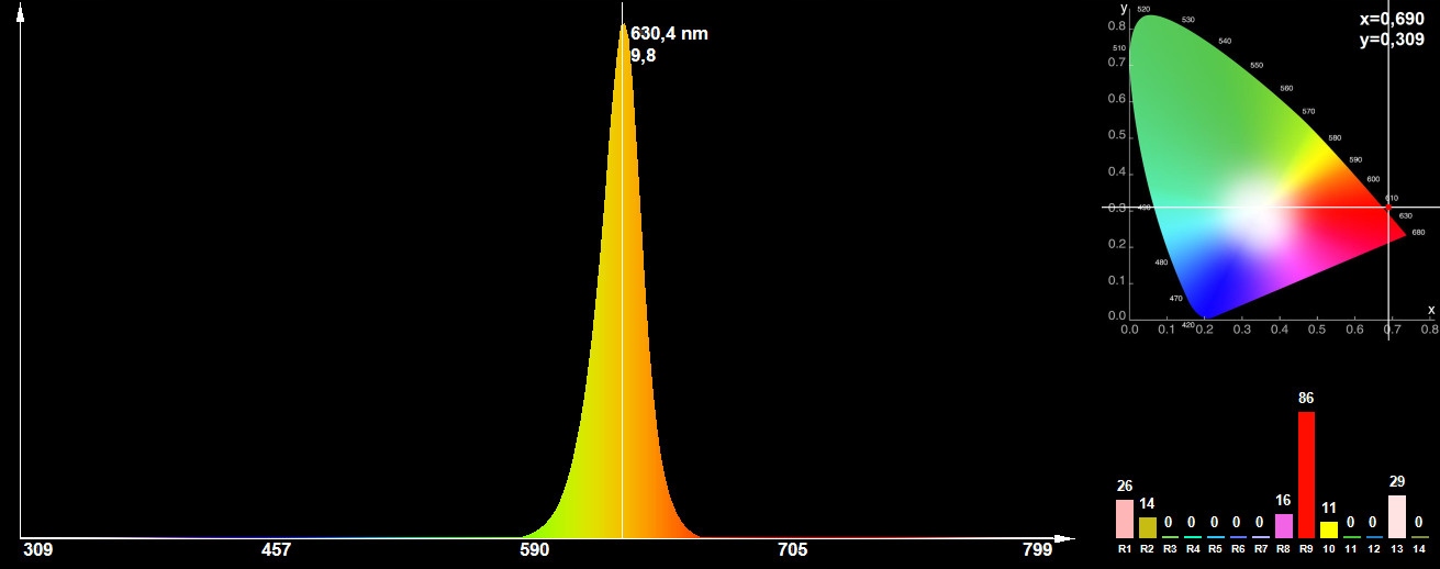 - домінуюча довжина хвилі - 620-630 нм ( 630 нм* )