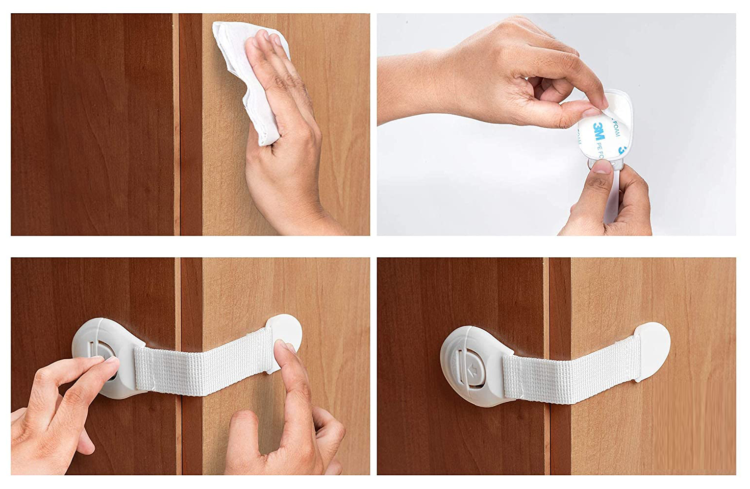 Щоб правильно розмістити замок, знежирте поверхню розчинником або оцтом. Потім відірвіть скотч від захисту, приклейте його в потрібне місце і потримайте деякий час. Щоб знову відкрити шафу, відкрийте лише одну сторону замка.