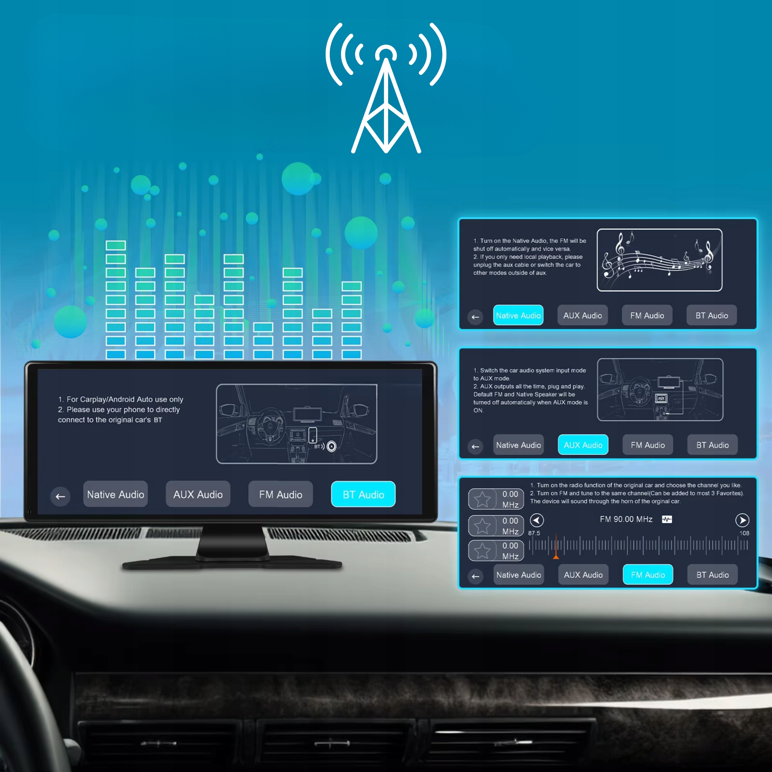 ✅Transmitm the sound to the loudspeakers of the car - via Bluetooth, AUX (included) or FM transmission