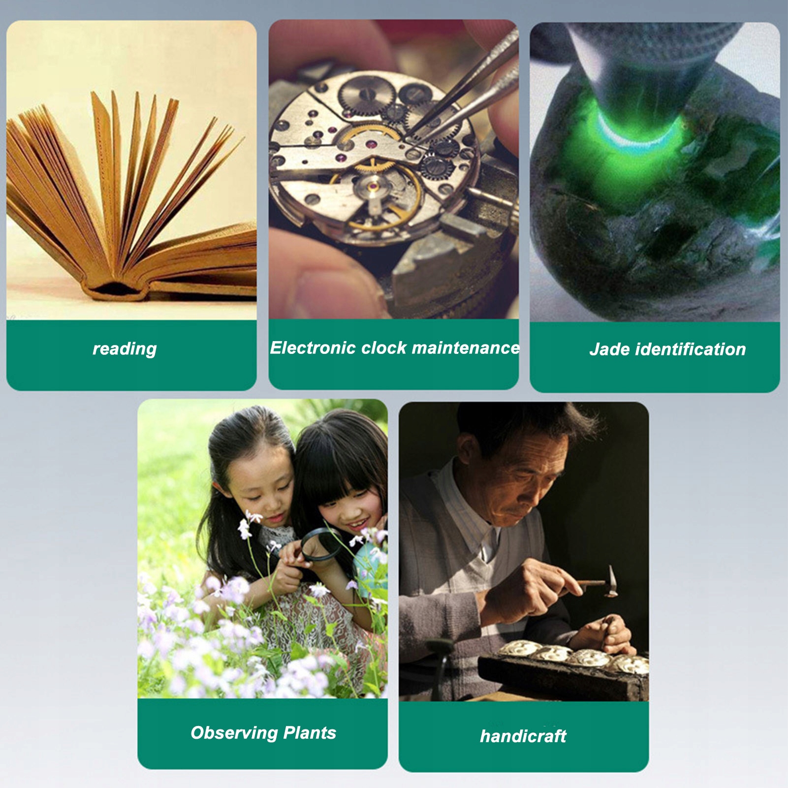 3. Hands Free: складна конструкція дозволяє використовувати лупу з підсвічуванням і кронштейнами як настільну лампу і як настільну лупу, для читання на столі або як лупу з ручкою, звільняючи руки та працюючи на близькій відстані.