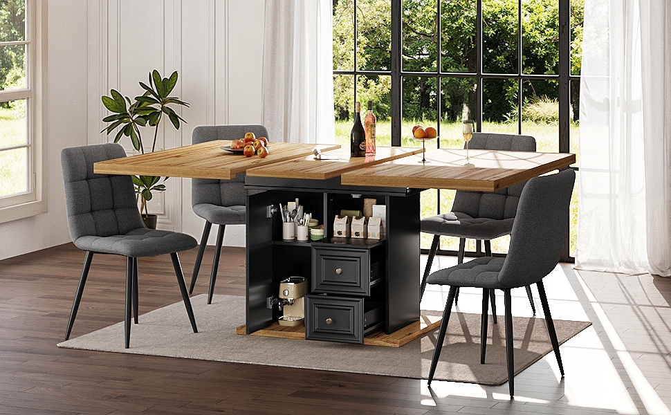 - Стільниця оснащена напрямними, які можна легко розкласти. Коли не використовується, подовжена частина ховається в прихованому просторі під стільницею, вирішуючи попередні проблеми зберігання.