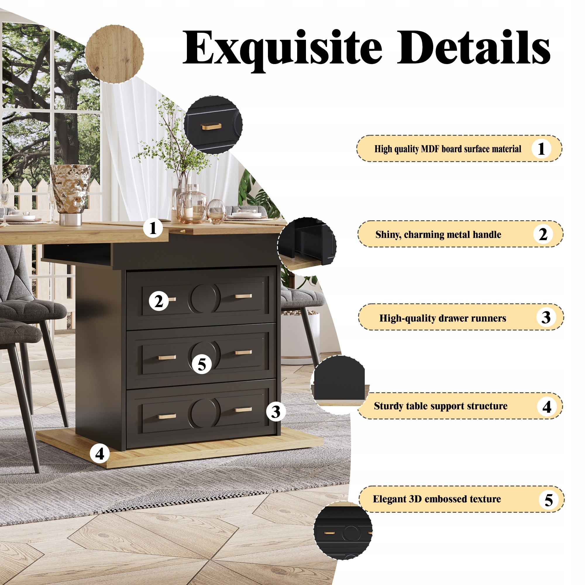 - Оснащений направляючими, які легко втягнути, ковзну поверхню можна зберігати під стільницею, коли вона не використовується, що вирішує традиційні проблеми зі зберіганням.