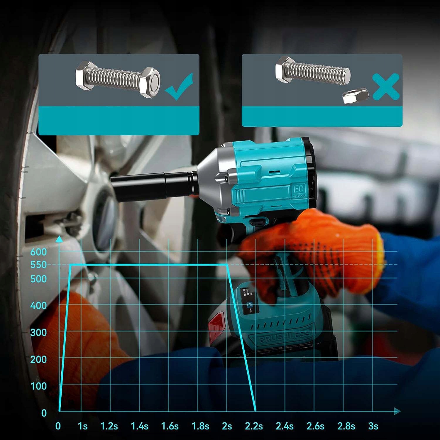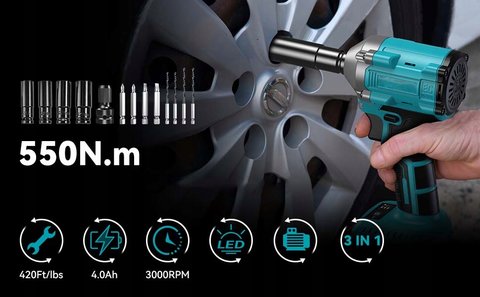 - ☑️Мотор з крутним моментом 550 Нм: компактний розмір, але абсолютна міцність на вигин. Цей акумуляторний ударний гайковерт має безщітковий двигун, який забезпечує максимальний момент розриву до 420 фут-фунтів (550 Нм). Легко використовувати для заміни автомобільних шин, закручування чи відкручування різних гайок, а також для роботи в автомайстерні для воїнів вихідного дня
