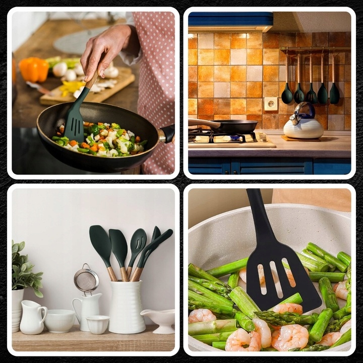 ✅ГНУЧКИЙ ТА НІЖНИЙ - силікон — це гнучкий матеріал що не дряпає поверхню посуду та сковорідки. Силіконові інструменти дбайливо впливають на покриття посуду, каструль і сковорідок, не дряпають і не пошкоджують поверхню.