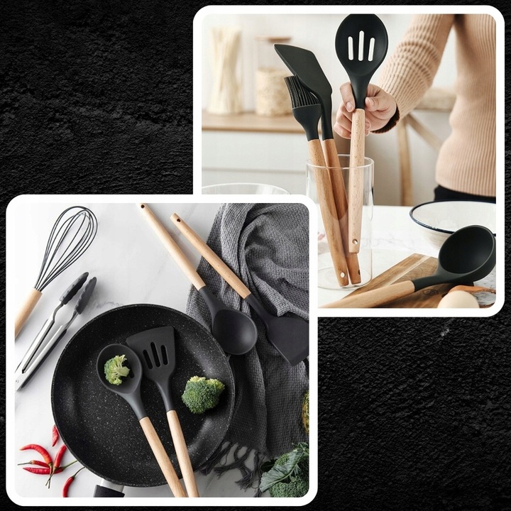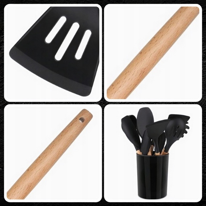 ✅ ВЕЛИКИЙ НАБІР - весь набір складається з 12 предметів. 11 посуду та ємність для посуду. Кожен інструмент робить щось своє. Є лопатки, черпаки, захоплювач макаронних виробів, віночок, ложки, щипці та пензлик.