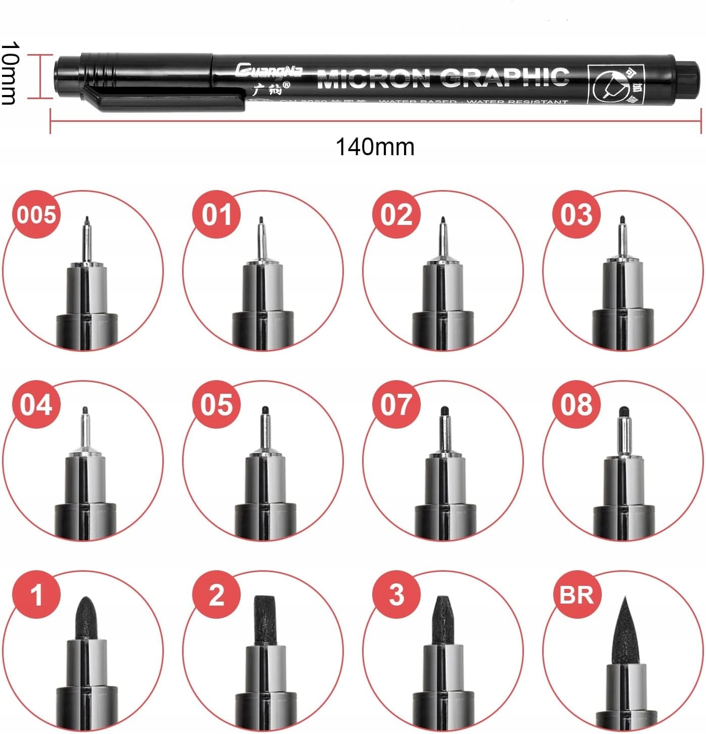 - ✅ Універсальність розмірів - Набір містить 12 тонких ліній із різною товщиною пера: 0,05 мм, 0,1 мм, 0,2 мм, 0,3 мм, 0,4 мм, 0,5 мм, 0,6 мм, 0,7 мм, 0,8 мм, 1 мм, 2 мм, 3 мм і БР, що дозволяє малювати різноманітні лінії у візерунках.