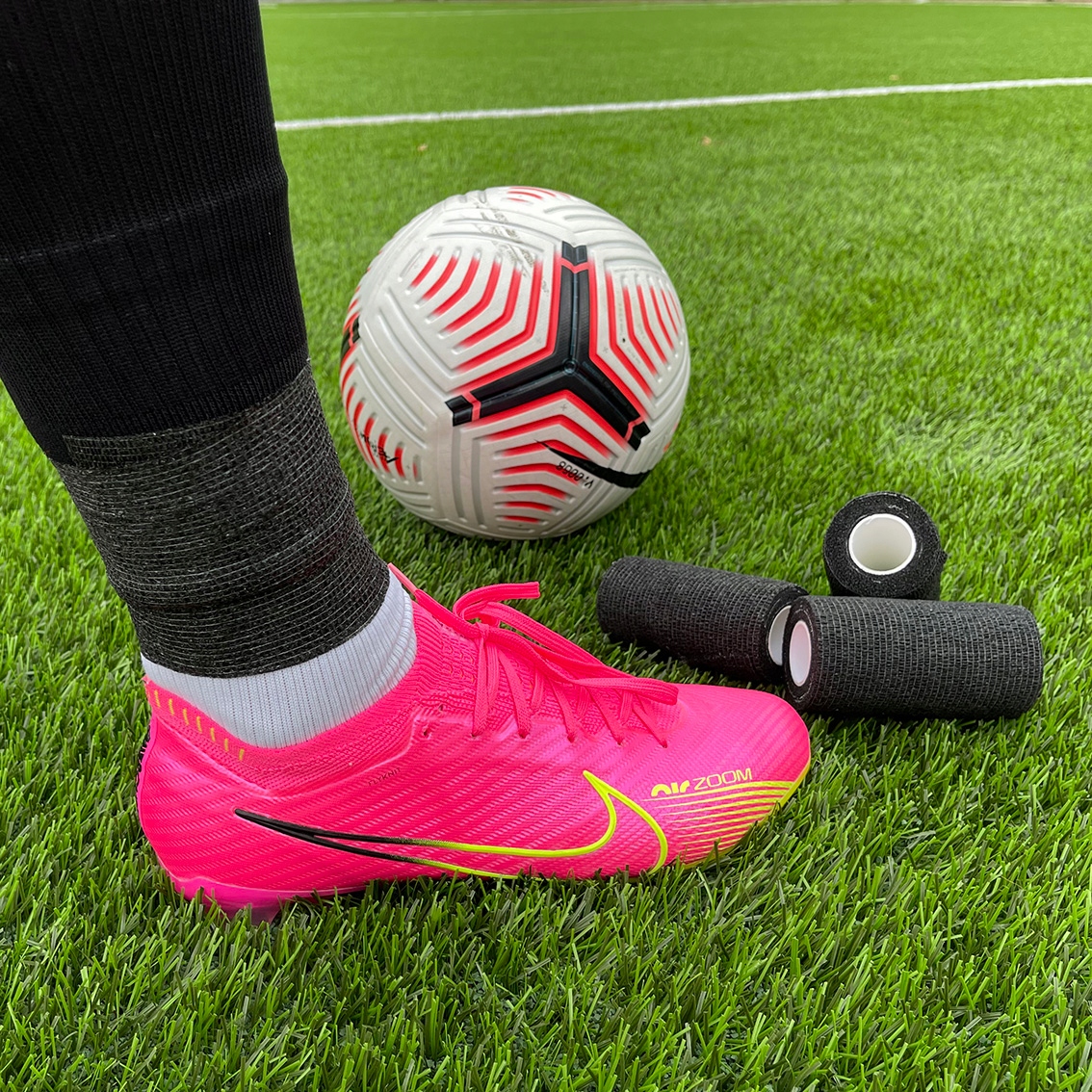 Оскільки в шкарпетках без стопи протектори можуть рухатися під час гри, необхідно міцно їх стабілізувати. І тут стають у нагоді клейкі стрічки (бинти). Спеціально розроблений, щоб бути легким, гнучким, міцним, не відшаровуватися під час бігу чи удару по м’ячу, створюючи відчуття комфорту в найекстремальніших футбольних умовах.
