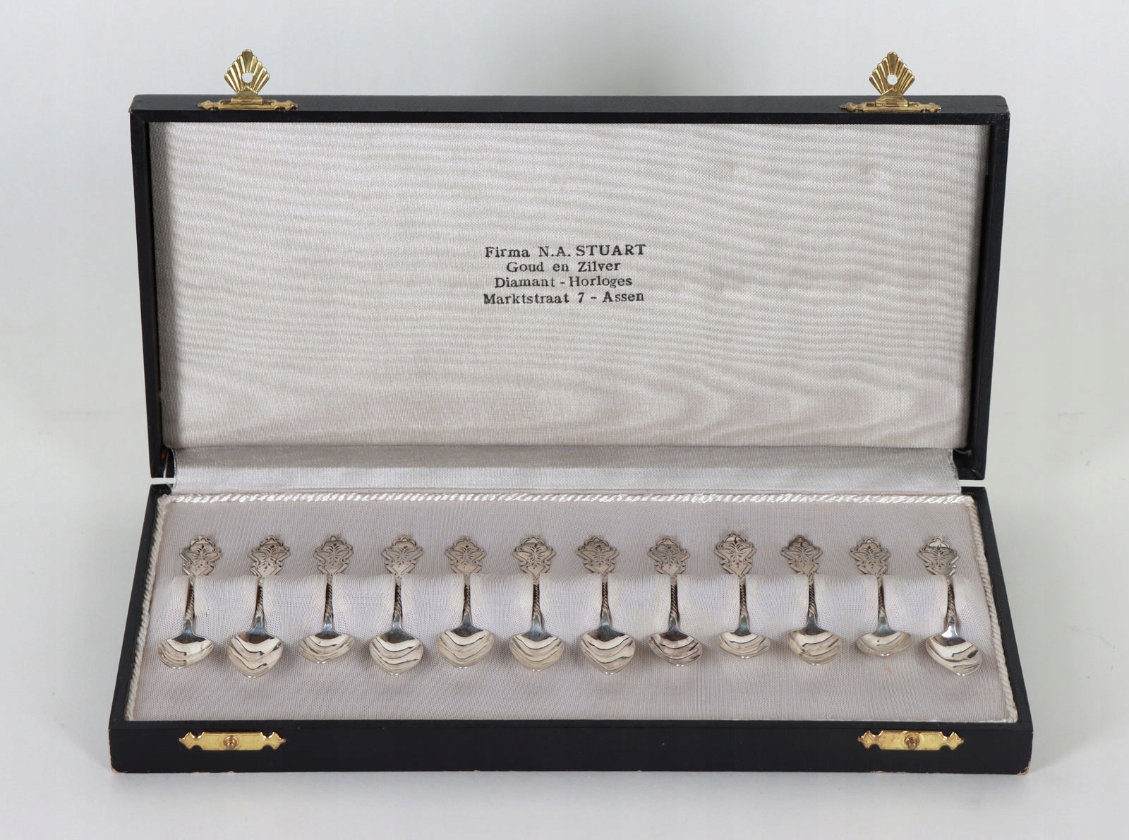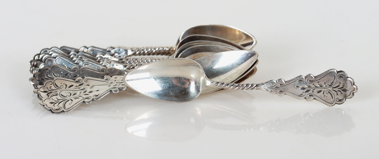 Кавові ложкизі срібла 833 проби. Ручки з вигравіруваними рослинними мотивами. Ложки в оригінальному футлярі для продажу.