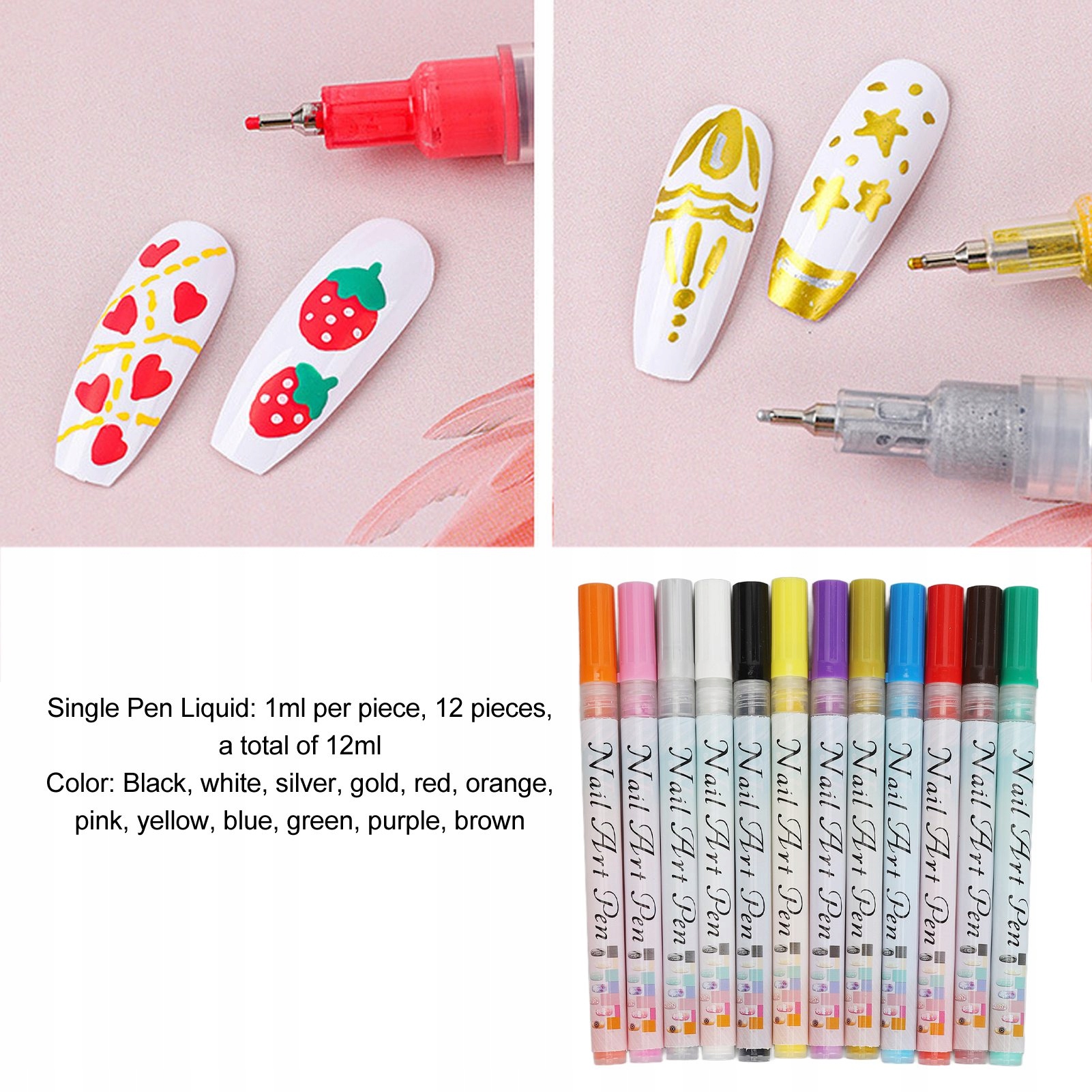 1, 12 кольорів: цей набір містить 12 яскравих кольорів із шириною лінії 0,5 мм, що дозволяє створювати складні та детальні візерунки на нігтях. Тонкі лінії малювання спрощують початківцям і дітям швидко малювати татуювання на нігтях.