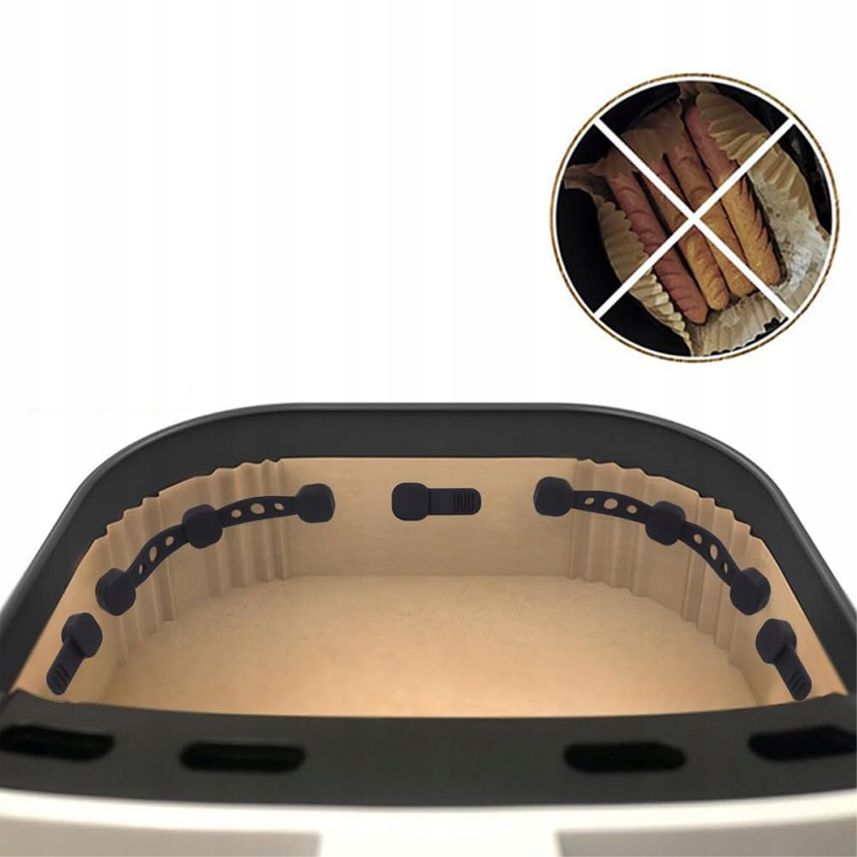 Магнітне силіконове закриття фритюрниці розроблено спеціально для захисту пергаментного паперу всередині пристрою. Це ефективно запобігає прилипанню одноразової паперової фольги до їжі або її контакту з нагрівальним елементом і підгорянню. Така конструкція забезпечує безпечніше приготування їжі та запобігає непотрібній небезпеці пожежі.