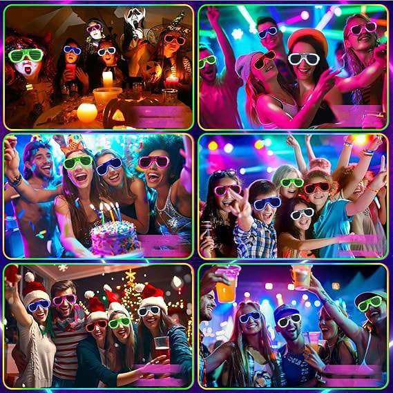 ✨✨【Безпечний спосіб насолоджуватися вечіркою】Підходить для більшості людей: один розмір для всіх. Особливості оправи окулярів гнучкий пластик, без відблисків, ультрафіолетового випромінювання, ударів і тепла, тому зручний як для дорослих, так і для дітей. 3 режими освітлення можна перемикати за бажанням.