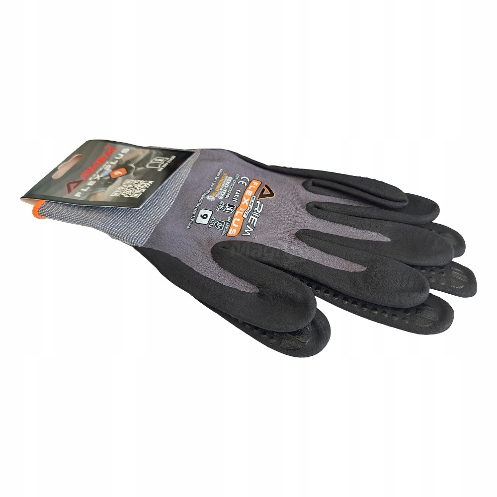 Захисні рукавички з поліефірного трикотажу сірого кольору, покриті чорним латексом з поролоновою структурою та нітрилова мікропіна з додатковим посипанням ARHEM FLEX PLUS