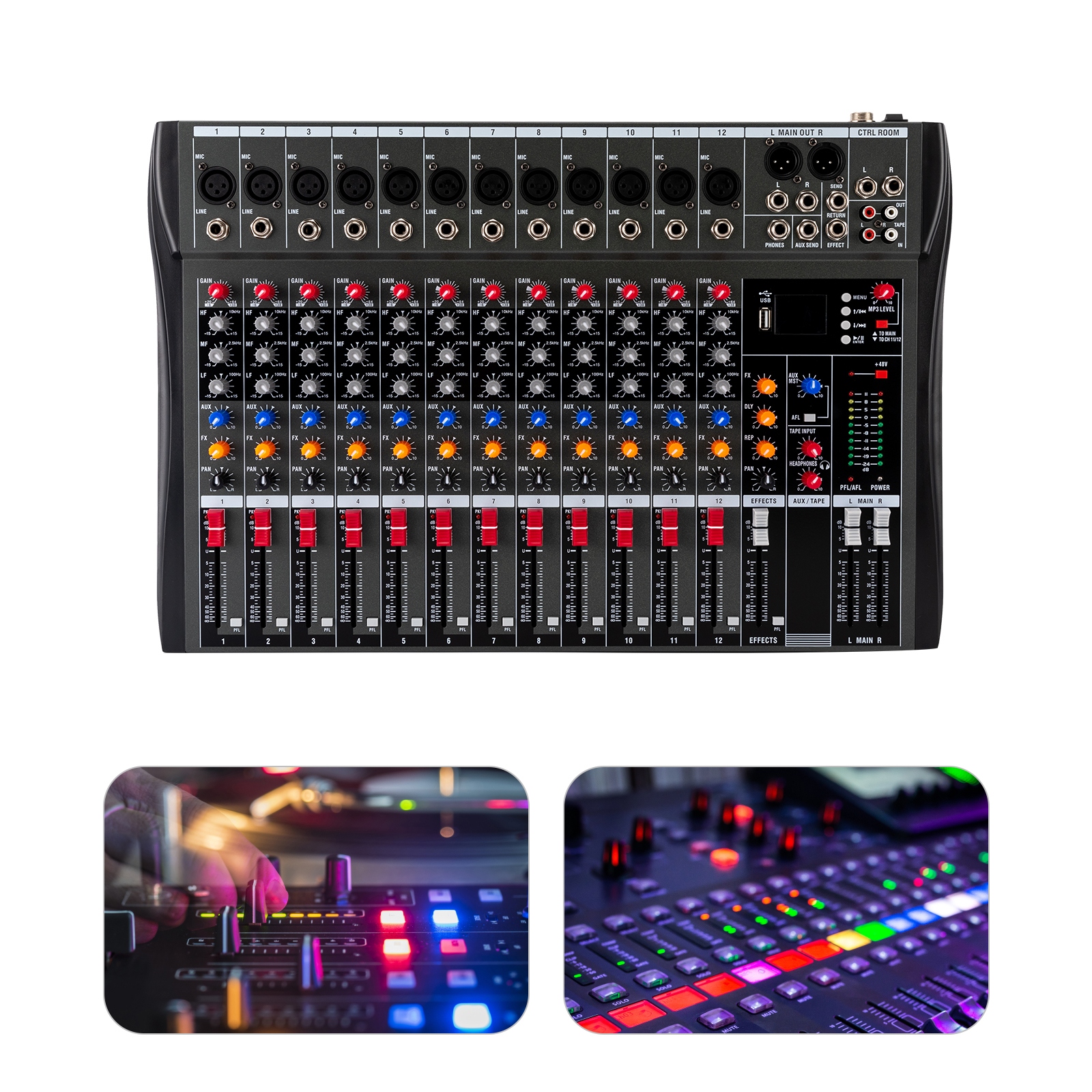 - 12-канальний мікрофонний вхід: Аудіомікшер ідеально підходить для підключення кількох пристроїв , оскільки має 12 каналів. Застосування різноманітних аудіо рішень, універсальний звук.