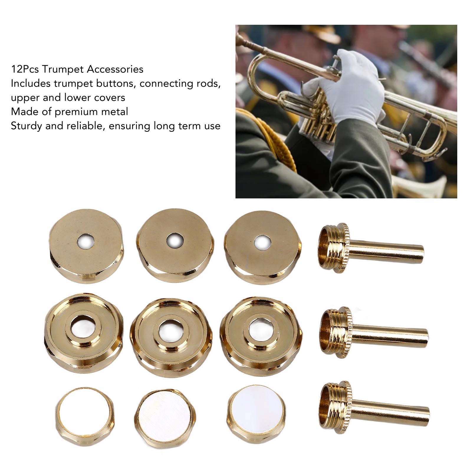 1. КОМПЛЕКТ 12 ШТ.: включає 3 шт. верхні кришки, 3 шт. нижні кришки, 3 шт. кнопки, 3 шт. шатуни. Цей професійний комплект може задовольнити ваші потреби щодо заміни. 2、Надійний метал: ці запасні частини труби виготовлені з металевих матеріалів, міцні та довговічні, можуть використовуватися протягом тривалого часу. 3、Просте встановлення: ці аксесуари для труби легко встановити та зібрати за допомогою простих кроків встановлення, що економить ваш час та зусилля. 4, УНІКАЛЬНИЙ ДИЗАЙН: кожен аксесуар був ретельно розроблений, щоб забезпечити ідеальну підгонку до вашого пристрою та забезпечити чудову продуктивність. 5、Покращення зовнішнього вигляду: із цими металевими чохлами ваша труба не лише чудово звучатиме, але й виглядатиме стильно та професійно.